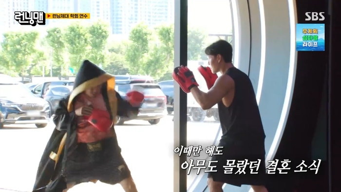 ‘런닝맨’.사진|SBS‘런닝맨’이김종국의결혼을자막으로언급했다.24일방송된SBS‘런닝맨’은‘런닝체대학회연수’특집으로꾸며졌다.이날오프닝에서는유재석과지석진이탁구,지예은이리듬체조,양세찬이체조,최다니엘과송지효가배드민턴선수로등장한가운데,김종국은하하와함께복싱선수연기를펼쳤다.‘런닝맨’측은하하와꽁트하듯복싱을하는김종국의모습을담아낸뒤“이때만해도아무도몰랐던결혼소식”이라는자막을달았다.김종국의결혼소식이‘런닝맨’멤버와제작진에게도‘극비’였던사실을짚은것.김종국은지난18일자신의공식팬카페에자필편지를게재하며“저장가갑니다”라고선언,결혼을공식발표했다.김종국.사진|스타투데이DB당시‘런닝맨’촬영을앞두고있던그는오프닝촬영에서직접결혼소식을전했다.SBS측은당초해당녹화분을다음달7일내보낼예정이었으나,김종국의결혼소식을향한폭발적반응에일주일앞당긴오는31일편성하기로결정했다.김종국의결혼소식은일주일이지나도록식지않으며‘62억원신혼집’,‘예비신부정체’등의키워드로관심이들끓고있는상황.과연김종국이31일방송되는‘런닝맨’에서어떻게결혼소식을전할지또그와절친한‘런닝맨’멤버들의반응은어떨지관심이집중된다.[김미지스타투데이기자]Copyright©스타투데이.무단전재,재배포및AI학습이용금지