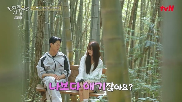 tvN‘진짜괜찮은사람’캡처tvN‘진짜괜찮은사람’캡처[뉴스엔유경상기자]이관희절친하정근이강소라절친최지은과마음을확인한후에핑크빛썸분위기를풍겼다.8월24일방송된tvN‘진짜괜찮은사람’에서는이관희절친하정근과강소라절친최지은이서로를선택하며통했다.하정근과최지은은데이트후에서로를선택하고나이와직업을확인했다.하정근은최지은에게“누나일수도있다”고말했지만실제로는하정근이최지은보다4살연상이었다.다음날아침에산책을하며하정근은최지은의직업에대해“내가유추한것과비슷한것같더라.스튜디오촬영이야기했잖아”라고반응했고,최지은은하정근의직업에대해“M&A.놀랍지않았다.그럴수있겠다”고했다.두사람이서로를선택했음을드러낸것.이어하정근은“(최지은이)나중에합류했는데전혀틈이안보였다.그짧은시간에는.틈도안보였고너한테여유도안보였고.그래서룸을만들기위해서계속망치질을했다”고직진했다.하정근은“확실히이사람은자기를편하게만들어주는사람에게본인도편하게느끼고그런걸보면서다음날에도부담을주고싶지않았다.뭐를해도다편했으면좋겠다”고말했고최지은은“편했다.감사했다.질문같은걸편하게대답할수있는질문을많이해줘서‘라고말했다.이어하정근은최지은과대화중에“애기네”라고말하며자연스럽게터치를하는등핑크빛썸분위기를풍겼다.최지은은“애기라뇨.애기는아니죠”라며웃었다.(사진=tvN‘진짜괜찮은사람’캡처)뉴스엔유경상yooks@기사제보및보도자료[email protected]ⓒ뉴스엔.무단전재&재배포금지Copyright©뉴스엔.무단전재및재배포금지.