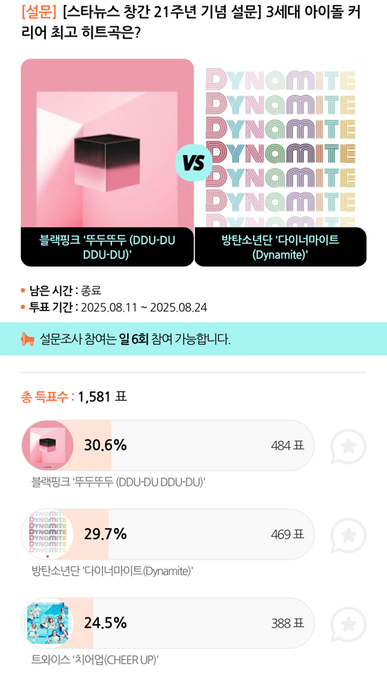[스타뉴스|허지형기자]/사진=스타폴그룹블랙핑크(BLACKPINK)의'뚜두뚜두'(DDU-DUDDU-DU)가3세대최고히트곡으로선정됐다.모바일아티스트종합콘텐츠앱스타폴(STARPOLL)에서는지난11일부터24일까지'3세대아이돌커리어최고히트곡은?'이라는주제로설문조사가진행됐다.이번설문은스타뉴스창간21주년을기념해열렸다.3세대아이돌최고히트곡의영광은블랙핑크에게돌아갔다.블랙핑크의'뚜두뚜두'가총득표수1581표중484표를얻으며1위를차지했다.469표를받은방탄소년단의'다이너마이트(Dynamite)'가2위에올랐다.3위는388표의트와이스'치어업(CHEERUP)'이다.뒤이어4위세븐틴'아주나이스(아주NICE)',5위여자친구'시간을달려서(Rough)',6위NCT127의'영웅(英雄;KickIt)',7위레드벨벳의'빨간맛(RedFlavor)',8위몬스타엑스'슛아웃(ShootOut)'순이다.한편스타폴은뉴스,커뮤니티,공연정보등최애스타의모든것을한곳에서즐길수있는아티스트종합콘텐츠서비스다.팬들이내가좋아하는스타의모든것을공유하는팬덤놀이터다.허지형기자[email protected]©스타뉴스&starnewskorea.com,무단전재및재배포금지