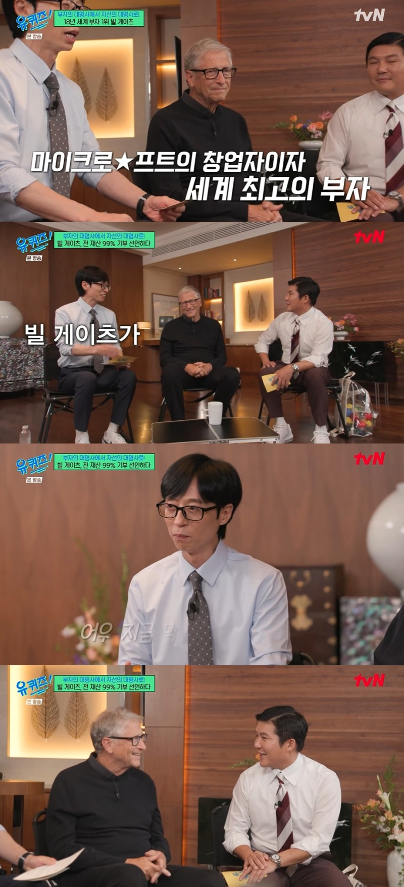 [TV리포트=남금주기자]빌게이츠가기부에관해밝혔다.27일방송된tvN'유퀴즈온더블럭'(이하'유퀴즈')에서는글로벌특집으로,마이크로소프트(MS)공동창업자이자게이츠재단이사장인빌게이츠(BillGates)가등장했다.이날빌게이츠를맞이하기10분전,유재석,조세호를포함한'유퀴즈'모두가긴장했다.경호원이먼저와서현장을둘러봤고,유재석은"오늘따라유독녹화장이조용하다"라고말하기도.제작진이"긴장좀푸세요"라고하자유재석은"다같이긴장한거아니냐"라고말하며"내가토크를하다하다빌게이츠이사장님과토크를"이라고신기해했다.40년전빌게이츠집무실을재현한현장에드디어빌게이트가등장했고,유재석은"대단한영광"이라며빌게이츠를반겼다.유재석은"너무깜짝놀라고기뻐서할말을살짝잃었다.이분이나올줄꿈에도몰랐다"라면서빌게이츠를소개했다.유재석은"가문의영광"이라고했고,조세호도"저희부모님이기뻐하더라"면서감격했다.31세최연소억만장자가된빌게이츠는이후총18년간세계부자1위에올랐고,2000년자선사업을시작,140조원을기부했다.빌게이츠는자선활동을시작한계기로"누구나부모로부터가치관이많이형성되지않냐.부모님이부유하진않지만,기부,봉사를많이하셨다"라고말문을열었다.빌게이츠는"제가성공하기시작하자어머니는여러종교서적에나오는말을해주셨는데,주어진것이많을수록그만큼의책임과의무가따른다는것이었다"라면서두번째커리어에선부를사회에환원할거라밝혔다.지난5월,게이츠재단25주년기념식에서빌게이츠는2045년까지재산의99%280조원을기부하겠다고선언했다.빌게이츠는"운이좋았다.회사지분이큰가치를갖게됐으니까"라며"그돈을저를위해쓸생각은없고,아이들이가업을잇는것도믿지않는다"라고밝혔다.유재석은"통역을듣고있는데,이순간이꿈인가아직도믿기지않는다.제질문에저를보고대답을해주는데,가슴이떨린다"라고솔직히말하기도.빌게이츠는1년에두차례일주일간외부와단절하고사색과독서에몰두하는'생각주간'을가진다고.이에대해빌게이츠는"나이들수록일하는게점점버거워진다.그러다보면미래를내다볼여유가없어진다"라며"인터넷이등장했을때마이크로소프트는적응하지못할거라고했지만,우린해냈다.당시에도전'생각주간'을활용했다"라고밝혔다.빌게이츠는자신에게영향을준책세권을언급했다.스티븐핑커의'우리본성의선한천사',한스로슬링의'팩트풀니스',바츨라프스밀의'세상은실제로어떻게굴러가는가'였다.그런가운데빌게이츠는"하루에얼마나쓰냐"는'유퀴즈'자기의질문에"솔직히말하면전꽤좋은집에산다.큰정원,요리해주는분들,여행할때도전용기를탄다.그건죄책감이들때도있지만.전사실돈꽤많이쓴다"라고털어놓았다.이어빌게이츠는"삼성폴드폰을쓰는데,아주좋은기종이다.다만이건이재용회장이선물해줘서돈을내진않았다"라고덧붙였다.남금주기자[email protected]/사진=tvN'유퀴즈'Copyright©TV리포트.무단전재및재배포금지