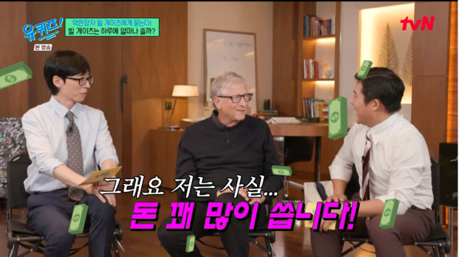 [OSEN=박근희기자]'유퀴즈온더블럭’빌게이츠가하루지출액에대한질문에솔직한답변을내놓았다.27일오후방송된tvN‘유퀴즈온더블럭’에는빌게이츠가게스트로출연했다.마이크로소프트창업자빌게이츠가전재산의99%를사회에환원하기로한결정에대해진솔한생각을밝혔다.빌게이츠는"정말운이좋았다.회사지분이큰가치를갖게됐다"고말했다.이어"그돈을저를위해쓸생각이없다.아이들이가업을잇는것도믿지않는다"라며"제게남은것들은사회에돌려줘야겠다고마음먹었다"고전해눈길을끌었다.빌게이츠의소박한취향도공개됐다.그는"일주일에네번은햄버거와감자튀김을먹는다"고밝히며'햄버거덕후'임을인증했다.가장좋아하는버거는치즈버거라고덧붙였다.“하루에얼마나쓰냐"에대한질문에빌게이츠는"저는꽤좋은집에서살고있다.아주큰정원이있고맛있는음식을해주는분도있다.전용기를탄다.죄책감이들기도한다"며솔직하게자신의씀씀이를공개했다.빌게이츠는"저는사실돈을꽤많이쓴다"며인간적인면모를드러냈다.특히그는"삼X폴드폰을쓰고있는데아주좋은기종이다.다만이건이재용회장이선물해줘서제가돈을내지않는다"고말해웃음을자아냈다./[email protected][사진]‘유퀴즈온더블럭'방송화면캡쳐Copyright©OSEN.무단전재및재배포금지.
