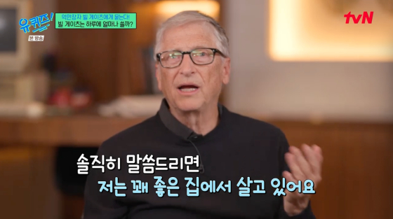[스타뉴스|김노을기자]/사진=tvN방송화면빌게이츠가가장좋아하는음식부터하루지출비용까지모든것에답했다.27일방송된tvN예능프로그램'유퀴즈온더블럭'에는마이크로소프트(MS)공동창업자이자게이츠재단이사장인빌게이츠가출연했다.이날조세호는빌게이츠에게"평소콜라와치즈버거를좋아한다고들었다"고물었다.빌게이츠는"일주일에네번은햄버거와콜라를먹는다.거의항상치즈버거를시킨다"고웃으며말했다./사진=tvN방송화면빌게이츠가햄버거만큼좋아하는것은책이라고.그는매년두차례사색에몰입하는'생각주간'을보내고있다.빌게이츠는이에대해"나이가들수록일을하는게힘들어진다.그러다보면호기심을추구하거나미래를내다볼여유가없어진다.열린마음으로큰변화를바라보려면일상적인업무에서벗어나내스스로에집중하는시간이필요했다"고설명했다.유재석은"책을추천해달라"고물었고,빌게이츠는"내게많은영향을준책세권이있다"면서스티븐핑거의'우리본성의선한천사',한스로슬링의'팩트풀니스',바츨라프스밀의'세상은실제로어떻게굴러가는가'를추천했다./사진=tvN방송화면하루에얼마를쓰느냐는질문에도답했다.빌게이츠는"솔직히말하자면나는아주좋은집에서살고있다.여행할때도사실전용기를타고,요리를해주는직원도있다.나는사실돈을꽤많이쓰고있다.휴대전화는이재용회장이선물해준삼성걸사용하고있다"고너스레를떨었다.또한,빌게이츠는AI시대에필요한교육은무엇인지궁금하다는질문을받고"모든사람이코딩을좋아하는건아니다.나는어린아이들에게코딩교육을강요하고싶지않지만만약수학,코딩,공학,과학을좋아한다면엄청난기회가있을거다.하지만결국자신이잘하는걸찾아야한다.평생무언가를배워야하는환경에서는유연해야한다"고답했다./사진=tvN방송화면'인간은일하기위해태어난존재가아니다'라는말을했던빌게이츠.이에대해그는"AI가충분히발전하면부족한것이없는시대에도래할것"이라며"결국자신이무엇을해야보람을느끼는지알게될거다"고부연했다.김노을기자[email protected]©스타뉴스&starnewskorea.com,무단전재및재배포금지