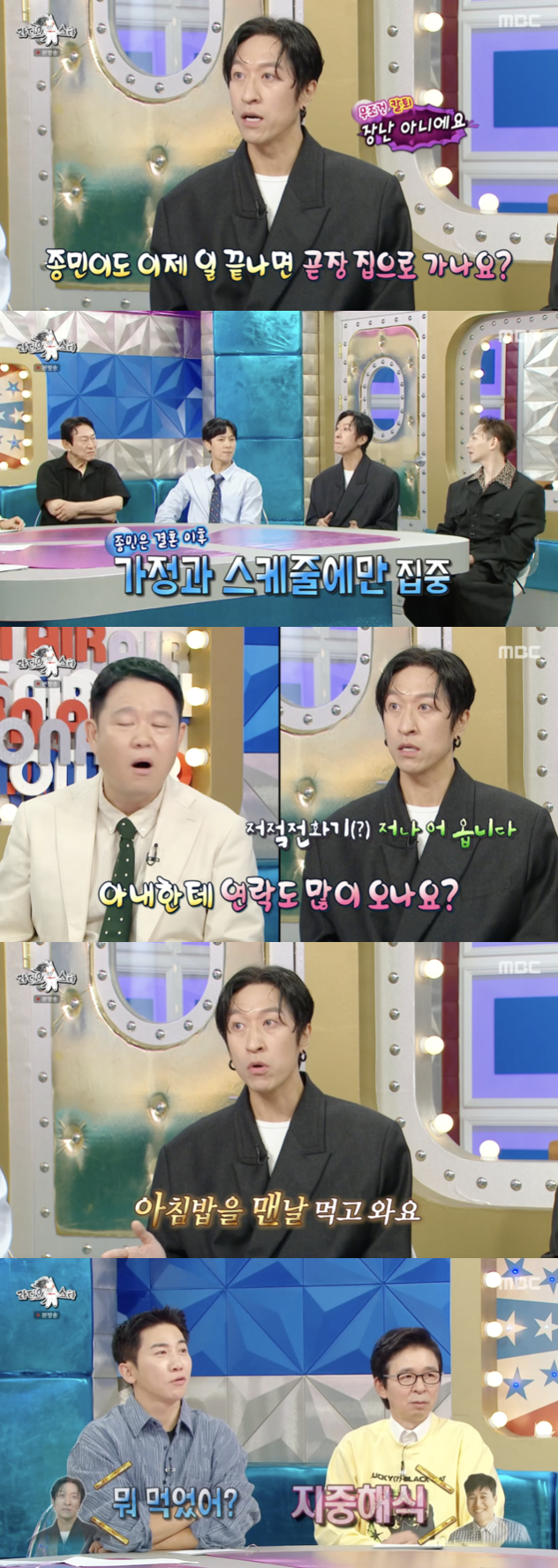 [스타뉴스|정은채기자]/사진='라디오스타'방송화면캡쳐결혼후달라진코요태멤버김종민의근황이전해졌다.27일밤방송된MBC예능프로그램'라디오스타'에서는배우김응수,신화김동완,코요태빽가,뮤지컬배우김호영이출연한'K-아재흥행헌터스'특집이전파를탔다.이날방송에서김구라는빽가에게코요태멤버김종민의결혼후변화에대해물었다.이에빽가는"장난아니다.일끝나고무조건집에바로간다"라고답하며김종민의철저히가정에집중하는면모를전했다.김구라가"아내한테전화도많이오냐"고묻자빽가는"전화도많이오고,전화도많이한다"라고밝혀눈길을끌었다.이어"그리고아침밥을맨날먹고온다.지중해식을먹고왔다고한다.샐러드,올리브오일을먹는다고한다"라며김종민의건강하고정성가득한결혼생활을부러워하는반응을보였다.정은채기자[email protected]©스타뉴스&starnewskorea.com,무단전재및재배포금지