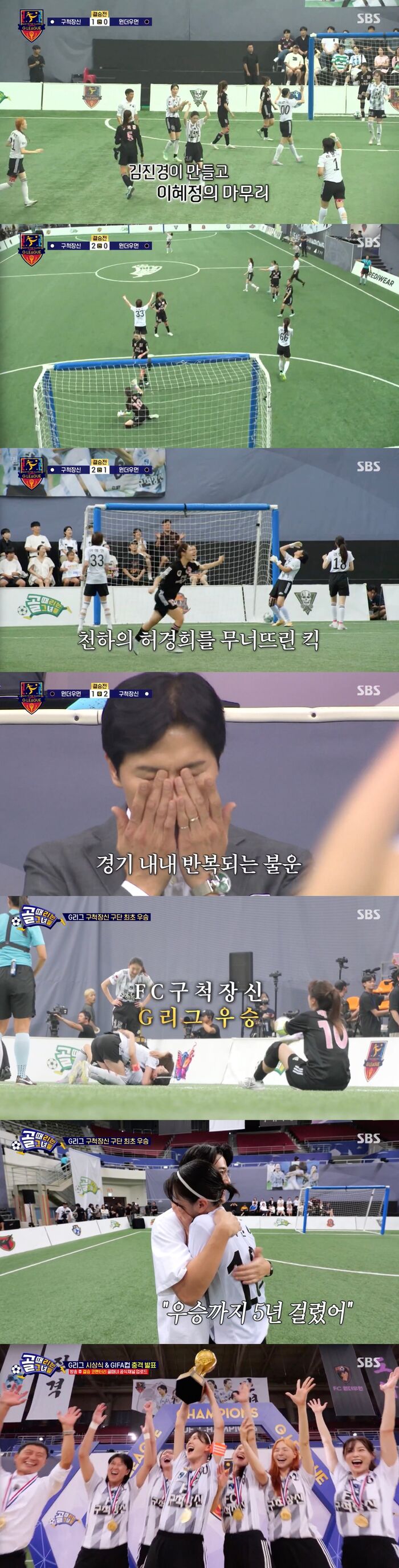[SBS연예뉴스|김효정에디터]구척장신이첫우승을기록했다.27일방송된SBS'골때리는그녀들'(이하'골때녀')에서는G리그의결승전이펼쳐졌다.이날방송에서는챌린지리그와슈퍼리그를통합한대통합리그G리그의결승전이진행됐다.구척장신과원더우먼은팀의첫우승을걸고남다른각오로경기에임했다.양팀은선제골을만들기위해필사적으로달렸다.선제골의주인공은예상을깨고구척장신이되었다.김진경의킥인이키썸의손을맞고나오자이혜정이골로마무리한것.세트피스명가다운선제골에박수가쏟아졌다.특히앞서악착같이볼을쫓으며팀의볼로만들어낸이현이의투지가팀의득점으로이어져눈길을끌었다.전반12분또한번의세트피스가결실을맺었다.김진경의추가골에경기를보던이들은놀라움을감추지못했다.세트피스로또한골내준원더우먼에조재진감독은타임을불렀다.그리고이것은만회골로이어졌다.전반12분,마시마가결국만회골을만들어낸것.마시마의슈팅을허경희가막았지만볼의파워를막지못해결국골이된것.2대1로구척장신이리드하며끝난전반전.후반전에도양팀의공격이이어졌다.하지만쉴새없는공격에도골은터지지않았다.특히마시마의슈팅은계속골포스트를맞히고튕겨나와아쉬움을자아냈다.경기막바지,양팀은체력이점점떨어졌고정신력으로가까스로버텼다.그리고마지막원더우먼의결정적인찬스를허경희가막아냈고경기는구척장신의승리로끝이났다.팀창단1,659일만의우승에주장이현이는그라운드에누워감동의눈물을흘렸다.이에누구보다그의노력을알고있는남편은이현이를안아주며축하했다.우승까지5년걸렸다는이현이는"한번도우승에한이맺혔다고생각을안했는데휘슬이울리는순간우승에한이맺혔구나싶더라.그순간5년의시간이스쳐지나갔다"라고소감을전했다.그리고우승에실패한원더우먼.마시마는"어려웠어요.너무아쉬워요.멤버들한테미안한마음도있고진짜우승하고싶었다"라며아쉬움의눈물을쏟아냈다.이날시상식에서는강보람과박하얀이득점왕을수상했고팀의우승을이끈구척장신의김진경이골롱도르를수상했다.그리고이날방송말미에는새로운리그가예고됐다.G리그를잇는다음리그는GIFA컵.단판승부토너먼트리그에레전드연합팀인불사조유나이티드가합류했다.또한하석주위원장은"GIFA컵대회후골때녀재정비가있을예정이다.지금의팀이름과멤버로뛸수있는마지막컵대회가될수있다"라고골때녀에큰변화가들이닥칠것을알려눈길을끌었다.Copyright©CopyrightⓒSBS.Allrightsreserved.무단전재,재배포및AI학습이용금지