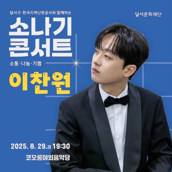 (엑스포츠뉴스이정범기자)이찬원이고향대구달서구에서열리는여름콘서트무대에오른다.최근달서문화재단은8월29일오후7시30분코오롱야외음악당에서'2025소나기콘서트'를개최한다고밝혔다.'소나기콘서트'는대구광역시의대표적인여름음악공연으로,2018년부터달서구와한국지역난방공사가공동후원하고있다.올해의주제는'뮤지컬부터트로트까지,세대와계층을아우르는콘서트'로,이에달서구를대표하는아티스트현대무용(최댄스컴퍼니),뮤지컬(브리즈뮤지컬컴퍼니),대중음악(단비)등장르별공연이이어질예정이다.그리고이무대에이찬원도함께한다.그는달서구소재의선원초등학교,성곡중학교,경원고등학교를졸업한달서구출신아티스트로,고향에서소통의시간을가질예정이다.한편,'2025소나기콘서트'는전석무료로진행된다.사진=달서문화재단SNS,이찬원팬클럽이정범기자[email protected]©엑스포츠뉴스.무단전재및재배포금지.