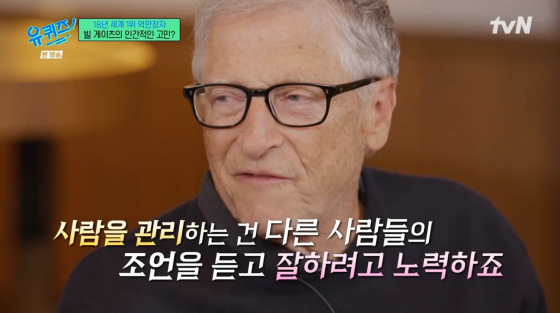 [스타뉴스|김노을기자]/사진=tvN방송화면빌게이츠가인간관계에대한고충을털어놨다.27일방송된tvN예능프로그램'유퀴즈온더블럭'에는마이크로소프트(MS)공동창업자이자게이츠재단이사장인빌게이츠가출연했다.이날빌게이츠는성공의원동력이무엇이냐는질문에"비전을세우는게가장중요하다"고답했다.유재석이"고민은무엇인지궁금하다"고묻자빌게이츠는"사실내가처음사람들을관리할때는꽤엄격했다.내스스로에하듯다른사람들을아주엄격하게대했다"고밝혔다./사진=tvN방송화면이어"시간이꽤지난후그건좋은방식이아니라는걸깨달았다.내가과학기술에는아주강한편이지만사람들관리하는건다른사람들의조언을들으려고한다"고솔직히털어놨다.이에유재석은"결국인간관계가가장힘들다는얘기다.우리랑똑같다.확가깝다.친밀감이느껴진다"고너스레를떨어웃음을자아냈다.빌게이츠는행복한순간에대해서도언급했다.그는"나는팀과함께문제를해결할때가장행복하다"며"성공못할것같던문제를방식을바꿔결국해답을찾을때가장행복하다고느낀다"고말했다.또"요즘엔자녀들이다양한걸알려주는데,그게행복하다.결국고민도행복도사람으로부터온다.지금까지의경험을보면나는세상에서가장운이좋은사람인것같다"고전했다./사진=tvN방송화면과거빌게이츠는결국컴퓨터가스스로생각하게될것이라고'AI미래'를예견했다.이와관련빌게이츠는"이미보건,의료쪽에서AI도움을받고있다.병원청구서를받은후궁금한게있으면AI가답을준다"고설명했다.이어"나는AI가의료를돕는걸아주긍정적으로생각한다"면서"나는인간의창의성과혁신을믿는다.나는지금까지혁신으로해결하지못한문제를본적이없다"고밝혔다.유재석은그런빌게이츠에게"게이츠재단이2045년문을닫는다고하던데이유가뭐냐"고질문했다.빌게이츠는"저소득국가들을보건,교육면에서제대로지원한다면그나라들이자립할수있으리라본다.우리가집중하고있는말라리아,영양실조,에이즈를100%막을수있는도구를가질것이라생각한다"고답했다.김노을기자[email protected]©스타뉴스&starnewskorea.com,무단전재및재배포금지