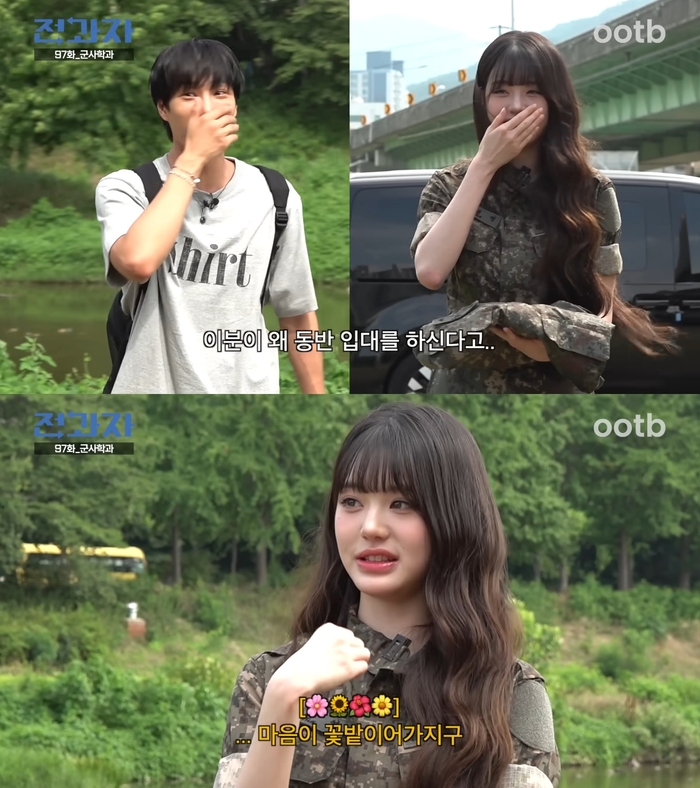 ‘전과자’.사진I유튜브채널‘ootbSTUDIO’캡처그룹아이브장원영이카이와동반입대를결심한이유를밝혔다.28일유튜브채널‘ootbSTUDIO’의‘전과자’에는‘단독)아이브장원영군입대현장공개’라는제목의영상이게재됐다.이날카이는서경대군사학과병영체험소식을듣고“진짜미친거아니냐”고분노했다.이어서공예동문이라는동반입대상대를추측했다.카이의동반입대상대는장원영이었다.장원영은“이거200만공약이군대가는거라고해서못기다리겠어서나오고싶다고했다”고말했다.카이가“나오는건너무좋다.그런데왜동반입대를선택했냐”고묻자장원영은“(다녀온)과들을봤는데너무많이가서‘같이가게된다면어딜가야할까’생각하다가‘그러면군대를가버릴까’생각했다”고답했다.카이는“이게보통일이아니다.오늘각오좀해야할거다”라고심란해했다.그러나장원영은“아직까지는마음이꽃밭이다”라고웃었다.[이세빈스타투데이객원기자]Copyright©스타투데이.무단전재,재배포및AI학습이용금지