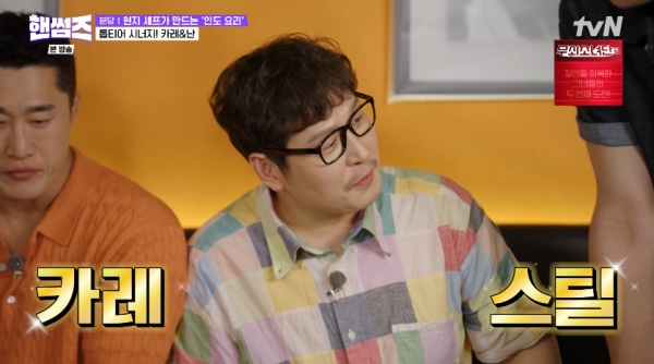 핸썸가이즈/사진=tvN캡처[스포츠투데이정예원기자]'핸썸가이즈'김풍이참을수없는식욕을드러냈다.28일방송된tvN예능'핸썸가이즈'에서는'핸썸즈'차태현,김동현,이이경,신승호,오상욱이게스트로출격한웹툰작가겸방송인김풍,배우류경수와경기성남시분당구맛집탐방에나서는모습이그려졌다.핸썸가이즈/사진=tvN캡처첫번째메뉴는인도요리였다.이들은인도식장비를갖추고현지호텔출신셰프가일하는'분당의타지마할'식당에도착했다.먼저차태현,이이경,류경수,김동현이버터치킨,치킨티카마살라,프라운마크니,팔락파니르를먹으며'폭풍먹방'을선보였다.이때'한입만찬스'를쓴오상욱은참지못하고음료를계속해서들이켜웃음을자아냈다.이에신승호와김풍마저그를따라하며어수선한분위기가됐다.김풍은류경수의바지에떨어진카레를손으로훑어먹기까지했다.그는"맛있다"며카레의맛을인정했다.화덕에서갓나온양갈비탄두리의비주얼도엄청났다.김동현은손으로고기를들고뜯으며감탄사를내뱉었다.[스포츠투데이정예원기자[email protected]]Copyright©스포츠투데이.무단전재및재배포금지.