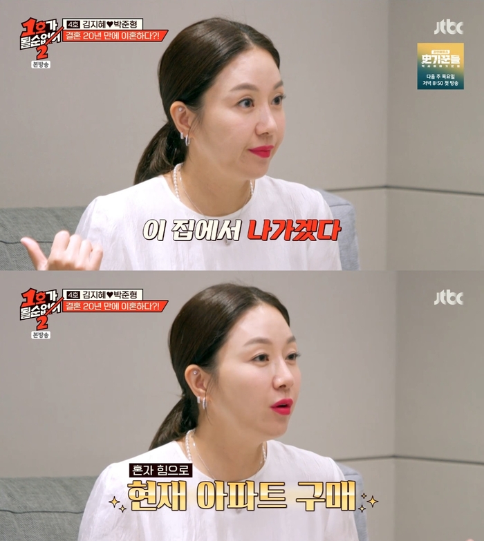 ‘1호가될순없어2’.사진IJTBC‘1호가될순없어2’방송캡처코미디언김지혜가반포90평아파트의대부분이자신의몫임을주장했다.28일방송된JTBC‘1호가될순없어2’에서는김지혜,박준형부부의이혼체험이그려졌다.이날김지혜는양소영변호사를만나남편박준형과이혼시재산분할에대해상담했다.김지혜는신혼첫날부터시집살이를하며왕따가된느낌을받았다고토로했다.김지혜는결혼생활을하며점점그늘지던자신의얼굴을보고는박준형에게분가의사를전달했다고밝혔다.그러나박준형은“분가는엄마가허락하면하겠다”고했다고.김지혜는“그냥월세로나왔다.그때미친듯이돈을모아서반포90평아파트를샀다”고말했다.이에이은형은“아파트만큼은김지혜의공을인정해야한다”고했다.김지혜는첫신혼집을20억원에매도해10억원으로시어머니전셋집을마련하고10억원으로(현재집)남은대출금을상환했다고설명했다.시어머니전셋집이박준형명의임을알게된양소영변호사는“그러면이것도재산분할에들어와야한다”고해모두를놀라게했다.한편‘1호가될순없어2’는이날방송을마지막으로시즌2를마무리한다.[이세빈스타투데이객원기자]Copyright©스타투데이.무단전재,재배포및AI학습이용금지