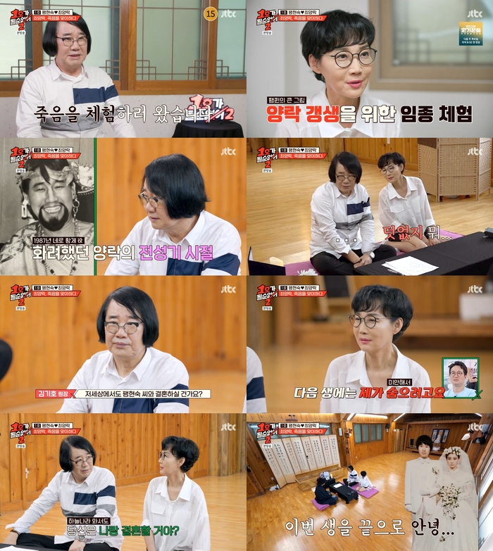 ‘1호가될순없어2’.사진IJTBC‘1호가될순없어2’방송캡처코미디언최양락이아내팽현숙을향한미안함을드러냈다.28일방송된JTBC‘1호가될순없어2’에서는팽현숙,최양락부부의임종체험이그려졌다.이날팽현숙,최양락부부는임종체험에나섰다.최양락은“오늘은죽음을체험하러왔다.아내이야기를들어보니까임종체험을하면이제까지살아온삶을반성하면서소중함도느낄수있다고하더라”라고말했다.팽현숙은“사실임종체험은남편보다나를위한거다.남편은자기가좋아하는것만한다.내가뭘좋아하는지,가정이어떤지관심이없다.그래서한번죽고나면새로운사람이되지않을까싶고,내남은인생이좀편하지않을까싶어서체험하러오게됐다”고했다.최양락은“우리부부가‘우리는언제쯤갈것이다’에대해이야기하는데예상한것보다20년빨리오니까굉장히당황스럽다”며임종체험을앞둔소감을밝혔다.최양락은자신의영정사진을보고는“저때가가장사랑을많이받았던때다.‘네로25시’코너를3년정도했다.저때진짜황제소리들어가면서방송도많이하고광고도많이찍었다”고회상했다.안내자가“저시절로돌아가서아내를만나면어떻게할거냐”고묻자최양락은“지금보다는더잘해줬을거다.(못해준걸)후회한다”고답했다.팽현숙은“나를종처럼부려먹었다”고토로했다.최양락은“지난삶을돌아볼때가장기억에남는장면은언제냐”는질문에“아무래도아내랑결혼할때다”라고답했다.이에이은형은“최양락이이런말하니까뭔가감동이다”라고이야기했다.안내자가“저세상에서아내를만난다면아내랑결혼할거냐”고묻자최양락은“내가미안해서,인간으로서너무잘못해준것같아서내가그냥숨을것같다”고답했다.팽현숙은“그게아니다.내가싫어서그런거아니냐.그렇게거짓말을하냐”고따졌다.이에최양락은팽현숙에게“그러면나랑결혼할거냐”고물었고,팽현숙은“안한다”고답했다.최양락은“둘다튼것같다”고해웃음을자아냈다.[이세빈스타투데이객원기자]Copyright©스타투데이.무단전재,재배포및AI학습이용금지