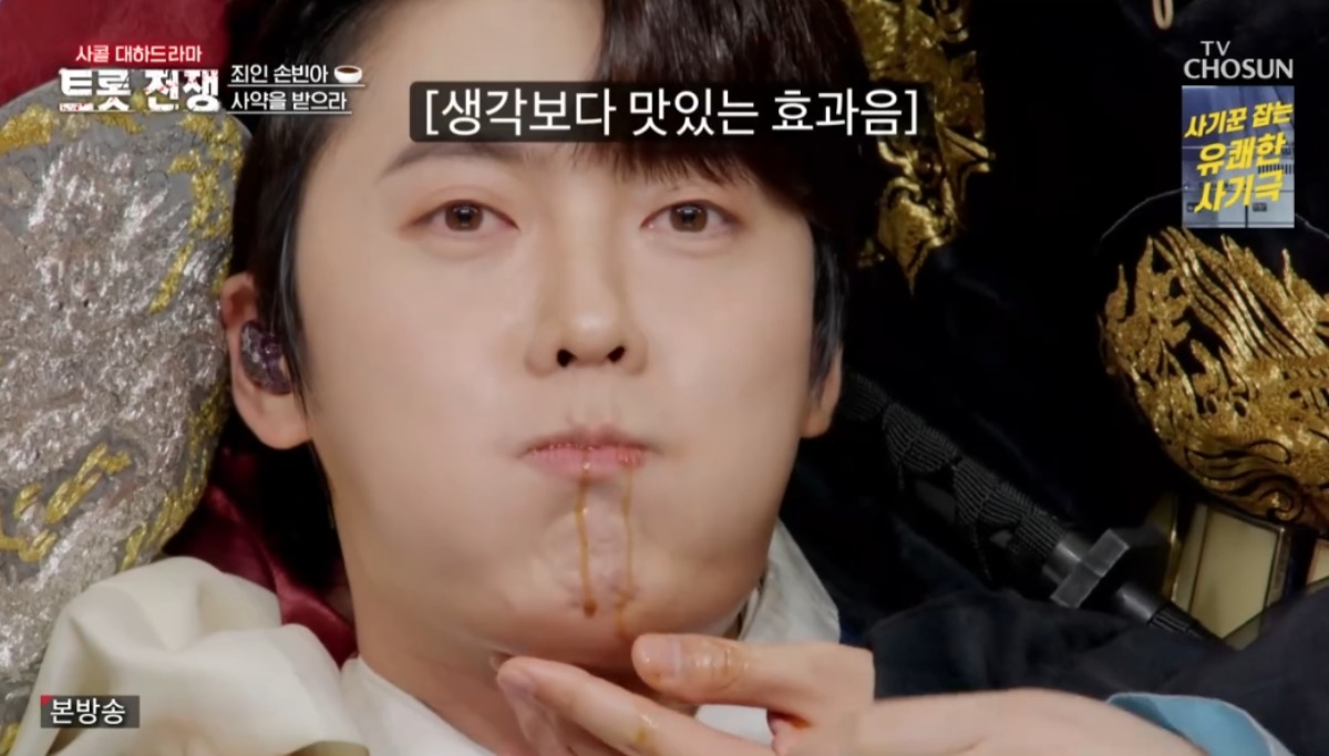 [텐아시아=임채령기자]사진=TV조선'사랑의콜센타세븐스타즈'캡처천록담과손빈아가대결을펼친가운데손빈아가패배해사약을하사받았다.28일밤10시방송된TV조선'사랑의콜센타세븐스타즈'에서는'트롯왕국의전쟁'특집이펼쳐진모습이그려졌다.이날방송에서한국트롯계를대표하는두수장조항조와진성이출격하며각각왕과황제로변신해눈길을끌었다.두사람이대표팀이되어서'미스터트롯'멤버들이팀에속하고대결을펼치는데이때승리하면상품이주어지지만패배하면사약을하사받게된다.이를듣던손빈아는"내가유일하게안먹어본것"이라고너스레를떨었다.이후본격적으로'트롯왕국의전쟁'이시작됐다.먼저조항조팀에서천록담이나섰고진성팀에서는손빈아가나섰다.무대시작전천록담은"지피지기백전백승이라했다"고하면서진성의노래'내여인'을선곡했다고밝혔다.그러자진성은천록담에게"내노래금지한다"며"부르기만하면자꾸노래를뺏어가냐솔직히내노래불러줘서고맙긴한데내밥줄끊어지겠다"고해웃음을자아냈다.사진=TV조선'사랑의콜센타세븐스타즈'캡처그러자손빈아는"눈에는눈이고이에는이다"며"조항조의노래를선곡했다"고하면서'사랑병'을부르겠다고했다.먼저천록담이무대를꾸몄다.천록담은뛰어난가창력을뽐냈고98점을받았다.MC들이"너무똑같이따라하면어떡하냐"고했다.이에천록담은"따라하는게아니다"며"그냥피가비슷한거다"고했다.여기서이를듣던김용빈은천록담에게"피가이쪽이아니라저쪽아니냐"고했다.천록담은갑자기상황극을하며진성에게"혹시굴다리에서절잃으셨냐"고했고진성도"말죽거리역에서그런추억이있긴있었다"고받아쳤다.이후손빈아가'사랑병'을불렀다.손빈아역시뛰어난가창력을뽐냈으나92점을받아사약을하사받았다.손빈아입에는사약이들어갔다.사실사약은갈근탕이었다.손빈아는힘겹게마시더니쓰러지는시늉을해웃음을자아냈다.임채령텐아시아기자[email protected]©텐아시아.무단전재및재배포금지.
