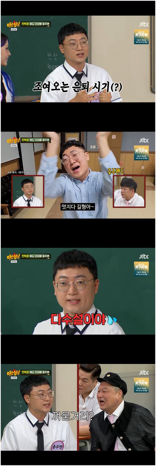 [OSEN=오세진기자]‘아는형님’유튜버공무원충주맨이100만구독자공약에대해허심탄회하게말했다.30일방영한JTBC예능‘아는형님’에서는충주맨이등장했다.어느덧충주시유튜버구독자수가88만명을찍은만큼,그의구독자100만명공약은은퇴여서질문이안나올수가없었다.충주맨은“실현이안될줄알고초강수로말한건데,진짜실현이될거같아서그걸어떻게해야할지생각을해야한다”라고말했다.이에김희철은“시장님이바뀌면어떻게되는거냐.그만두는거냐”라고물었다.시장은선출직이며,현재충주시장조길형은3선이라더는충주시장으로출마할수없다.충주맨은“거의다수설이다.시장님이바뀌면순장이거나껴묻거리다”라며덤덤하게말해웃음을안겼다.그는자신의후발주자로생겨난공공기관유튜브채널등에대해"후배들은더잘되면좋겠다"라며마치후학을양성한듯한스승같은발언으로한번더시선을끌었다.김희철은“공무원이면악성민원만나지않냐”라고물었다.충주맨은“악성민원인이참힘들다.많진않으시지만,안계셔야한다”라면서“나의경우지팡이로맞은적이있다.순서를헷갈리셔서저를때렸다.침을뱉을때도있었다.그건피했다”라고말해모두를놀라게만들었다./[email protected][사진출처]JTBC예능‘아는형님’Copyright©OSEN.무단전재및재배포금지.