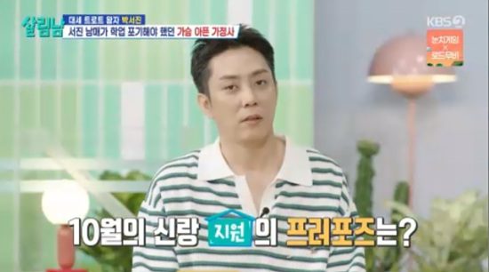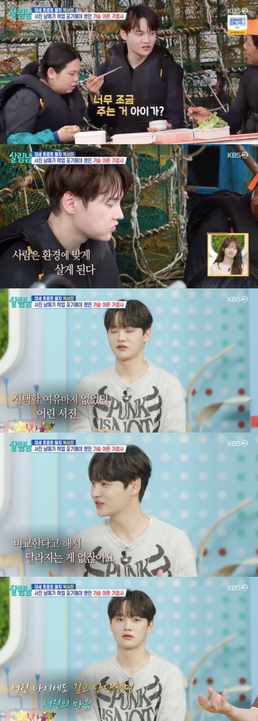 [OSEN=임혜영기자]가수박서진이가족을위해희생하는깊은마음씨를드러냈다.30일방송된KBS2TV'살림하는남자들시즌2'('살림남’)에는박서진가족의일상이공개되었다.박서진과아버지,동생은뱃일후식사를하기시작했다.진수성찬에박서진의동생은활짝웃어보였다.박서진의동생은뱃일을경험한후“아빠가어떻게50년동안했는지,오빠가어렸을때어떻게이걸했는지대단하다”라고말했고박서진은“닥치면다하게된다”라며덤덤하게말했다.박서진은이른나이부터학업을포기하고아버지의뱃일을도운바있다.박서진은“주어진일이고해야할일이었다.내가해야지만되는일이다.그래야살아갈수있었다”라고말했다.은지원은효자라고칭찬했다.MC들은박서진에게주위친구들과비교하지는않았냐고물었고,박서진은“친구들과비교한다고해서현실이바뀌는건아니다”라고말했다.이에지상렬은“안의씨앗이좋은것이다”라고박서진의인성을드높였다./[email protected][사진]KBS2TV'살림하는남자들시즌2'Copyright©OSEN.무단전재및재배포금지.