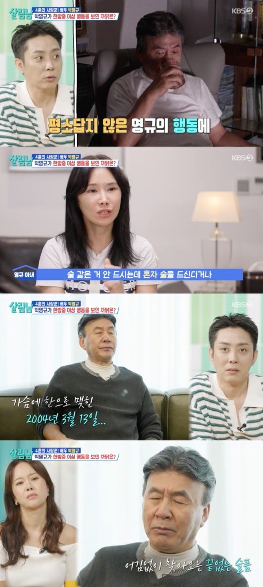 [OSEN=임혜영기자]박영규가씁쓸한마음을드러냈다.30일방송된KBS2TV'살림하는남자들시즌2'('살림남’)에는아들을그리워하는박영규의모습이그려졌다.박영규는한밤중까지잠을자지않고TV를시청하고있었다.홀로술까지마시는모습에아내는걱정된다는반응을보였다.아내는“저런모습을가끔보일때가있다.11월달(아들)생일때랑,3월기일에.술을안드시는데혼자술을드신다거나”라고설명했다.박영규는“6년이란세월이흘러딸이대학수능시험을앞두고있다.나도남들처럼자식에게해보고싶은마음이불현듯드는것이다”라고말했다.박영규는“아내의딸이지만내가잘키워야겠다.내가아들한테못했기때문에”라며재혼으로얻은딸에제대로아버지의노릇을하고싶다고말했다.은지원은“아들도계속곁에있었으면,그런생각이드실것이다.대입도챙기지못하고”라고설명을덧붙였다./[email protected][사진]KBS2TV'살림하는남자들시즌2'Copyright©OSEN.무단전재및재배포금지.