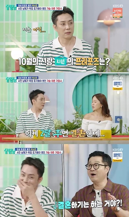 (엑스포츠뉴스원민순기자)'10월결혼'을앞둔은지원이아직프러포즈를안했다고밝혔다.30일방송된KBS2TV'살림하는남자들시즌2'에서는은지원이프러포즈를안했다고밝히는모습이전파를탔다.이날박서진은여동생박효정과함께아버지뱃일을위해나섰다.뱃일이처음인박효정은멀미때문에힘들어했다.박효정은계속구역질을하느라일을할수가없었다.박서진아버지는딸의멀미에"나까지멀미가나려고한다"며작업을그만하기로했다.박효정은일이마무리되자집에서야무지게챙겨온도시락가방3개를가져왔다.멀미가난다던박효정은먹을생각에바로괜찮아진모습을보였다.박서진은박효정이계속반찬통을꺼내자"냉장고반찬을다가져온거냐"며혀를내둘렀다.박서진아버지는"엄마는뭐먹으라고"라며아내의식사를걱정했다.박효정은식사를하면서"내가오늘아빠보고반했다.이걸어떻게50년했는지오빠도대단하고엄마도대단하고"라며뱃일을직접해본소감을전했다.학창시절부터뱃일을해왔던박서진은"닥치면다하게된다"고얘기해줬다.박서진은아버지한테어머니가아닌자식들과일을해보니어땠는지물어봤다.박서진아버지는"엄마혼자하는게너희보다훨씬빠르다"면서웃었다.박서진은아버지한테어머니가있을때잘하라고얘기했다.박효정은아버지가프러포즈를어떻게했는지궁금해했다.박서진아버지는프러포즈를따로하지는않았다고했다.프러포즈얘기가나오자스튜디오에서는예비신랑은지원의프러포즈에대한관심이쏟아졌다.2달후결혼하는은지원은아직프러포즈를안했다고털어놨다.지상렬은"프러포즈를안하면평생남는다던데"라며"결혼을하기는하는거냐.가상인거냐"고은지원의결혼을의심하기에이르렀다.'결혼선배'백지영은은지원에게감동스러운프러포즈를해주라고조언했다.은지원은오히려지상렬에게"형이라면어떤프러포즈를하고싶으냐"고물었다.지상렬은500원짜리동전을바다에던지고동전을찾을때까지사랑하겠다고말할것이라고했다.박서진어머니는박가들이뱃일을나간사이앞서남편과부부싸움을한여파로집을나서고있었다.박서진어머니는집을나오기는했지만갈곳이없어돌아가신어머니생각이많이났다고전해안타까움을샀다.사진=KBS방송화면원민순기자[email protected]©엑스포츠뉴스.무단전재및재배포금지.