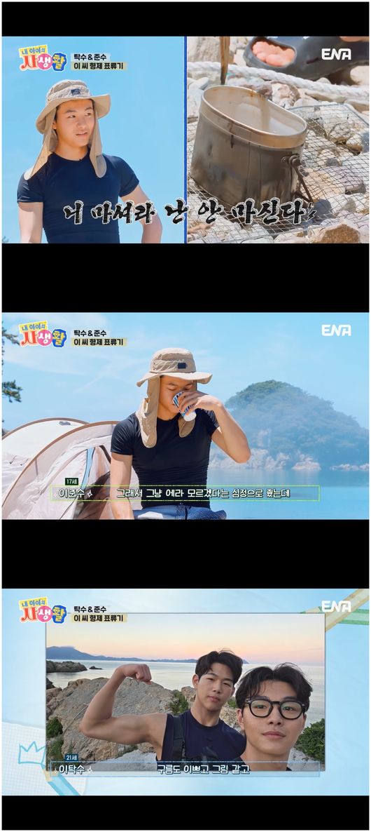 [OSEN=오세진기자]'내아이의사생활'이탁수가동생이준수의꾀에빠졌다.8월31일방영된ENA예능'내아이의사생활'(이하'내생활')에서는이탁수이준수형제의특별한여행기가그려졌다.이탁수는“오늘동생이저를위해여행을준비했다고해서힐링이라고생각하고왔다”라며설레는표정으로등장했다.이준수는“한국의크로아티아같은곳이다”라며형에게언질했다.이준수는“전다계획이있습니다.무인도에갈거예요.풀빌라는없어요.형이알면멱살을잡거나,욕을5분동안하거나,돌아갈것같다”라며속내를밝혔다.이들은배를타고,또타고들어가무인도에도착했다.아무것도없는해변에내린이탁수는멍한표정을지었다.이준수는“여기가우리리조트야”라면서"앞에바다가있으니풀빌라아니냐"라며너스레를떨었다.이탁수는“장난치지마.여기서텐트치고여기서잔다고?잘때어떻게하게.모기에다뜯기게?”라며경악했다.심지어텐트도원터치텐트였다.키가180~190cm를웃도는장신형제들은이런텐트에서함께잘수없었다.그럼에도이준수는희희낙락했다.이준수는“원래무인도에오면집을짓는다는게남자들의로망이아니겠냐.바닥에돌네개를두고합판을두고,기둥을세워서비닐로텐트를치는거다”라며온갖쓰레기를모으더니집을어설프게나마지었다.물론이후해가저물고해변가수위가높아져그집은무용지물이되었다.이탁수는“애초에들어왔을때부터사람이없더라고요.의심을했어야했는데,믿었던내가바보다”라며한숨을푹내쉬었으나,이내해루질을하며전복,소라,거북손등을채집하며집중했다.장윤정은“4살차이형제면준수가어려워하지않냐”라며놀라워했다.이종혁은“탁수가되게착해서동생을못혼낸다.그래서제가카리스마있게동생뒤통수한대때려봐라했는데도”라며이탁수가동생에게무르다는걸말했다.이탁수는“자연이런거보면서정신이맑아지더라.그런거보면서오길잘했다는생각을했다”라며오히려생각을전환한듯보였다.절정은저녁준비였다.파이어스틱으로켠짚풀모닥불에삼겹살을굽고,나무장작위반합을올려전복라면을끓인형제들은맛나게먹어치웠다.이준수는“이런레시피는많이해봤지만이런식으로해서먹는행복감은처음이다”라며기뻐했다.결국원터치텐츠안에서단둘이자게된형제들.이들은일어나산을헤맸고,먹을수없는버섯만캐왔다가거북손을쪄먹으며아침을떼웠다.이준수는형을위해믹스커피를끓이는등최선을다했다.이종혁은“아버지로서아들둘이오래도록이야기를하는걸보니까참좋다”라며흐뭇한미소를지었다.이탁수는“핑크빛하늘을봤을때가가장기억에남는다.노을지고,그런자연풍경이기억에남는다”라며말했으며이준수는“형이랑같이밥을먹을때,고기랑라면을먹을때가기억이난다”라고말했다.이어이준수는“이제형이랑일본에가고싶다.톰하디처럼차려입고일본에서야노시호님을만나는상상”라며다음여행을기약했다./[email protected][사진출처]ENA예능'내아이의사생활'Copyright©OSEN.무단전재및재배포금지.