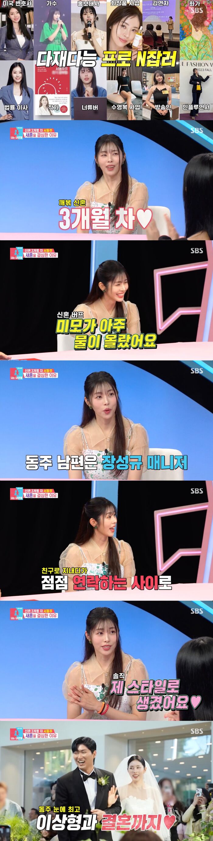 [SBS연예뉴스|김효정에디터]서동주가남편과가까워지게된계기를밝혔다.1일방송된SBS'동상이몽시즌2-너는내운명'(이하'동상이몽2')에서는방송인서동주가스페셜MC로등장했다.이날방송에서는다재다능프로N잡러결혼3개월차서동주가등장해눈길을끌었다.이에이지혜는"미모가아주물이올랐다"라며칭찬했다.이어서장훈은"장성규매니저가남편이라던데장성규의소개로만난거냐?"라고물었다.그러자서동주는"또래들모임에서친구로지내다가가까워지게됐다"라며"솔직히제스타일로생겼다.키도크고잘생겼다"라고설명했다.서동주는"제가밤에강아지산책을시키니까위험하지않냐며가끔씩왔다"라며남편이먼저플러팅을했다고밝혔다.그리고"그래서제가당시불면증이있어서좀재워주고가라고했다"라며자신의플러팅기술을고백해모두를놀라게했다.이지혜와이현이는"아니뭘어떻게재워줘?나이가몇살인데재워줘?"라고했고,서동주는"순수하게토닥토닥해달라했는데남편이자고가라고들어가지고"라며관계가발전하게된계기를밝혀눈길을끌었다.이에서장훈은"대놓고플러팅을하셨네"라며서동주의플러팅에놀랐다.그리고김구라는"화법이중간중간스킵을많이하네.내가좋아하는화법이야"라고너스레를떨어웃음을자아냈다.Copyright©CopyrightⓒSBS.Allrightsreserved.무단전재,재배포및AI학습이용금지