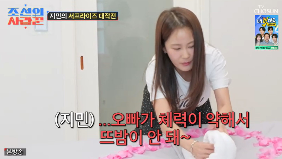 TV조선‘조선의사랑꾼’TV조선‘조선의사랑꾼’TV조선‘조선의사랑꾼’TV조선‘조선의사랑꾼’[뉴스엔하지원기자]코미디언김지민이남편김준호를위해이벤트를준비했다.9월1일방송된TV조선'조선의사랑꾼'에서는김준호김지민의신혼생활이공개됐다.김준호는침실외개인방이있었다.김지민은"침실이있는데코를너무심하게골면오빠가여기로피신한다"라고밝혔다.'골방같다'는지적에김지민은"마사지기가있는데골방이라뇨.신제품인데"라고농담했다.김지민은"제가하나씩채워주고있다"며"침대를사달라고는했는데안사줄거야.침대놔두면자연스럽게각방쓴다"라고덧붙였다.그러나김지민은김준호를위해서프라이즈를준비해놨었다.김지민은"오빠가하도침대사달라고노래해서깜짝서프라이즈로오늘날짜에맞춰주문했다"라고설명했다.김준호가중고거래를하러나간사이침대가도착했다.침대세팅을마친김지민은"뜨밤보내죠"라면서도"오빠가체력이안돼서뜨밤이안된다"라고너스레를떨었다.선물을본김준호는"이게뭐야,내침대야?진짜로?"라며깜짝놀랐다.김준호는벽치기자세로"오늘이방이야?"라고수위높은발언을해웃음을자아냈다.김지민이준비한선물이더있었다.바로최신형이동식TV.스튜디오에서김지민은"진짜방에서안나온다.밥먹을때랑변마려울때빼고는안나온다"라고전했다.뉴스엔하지원oni1222@기사제보및보도자료[email protected]ⓒ뉴스엔.무단전재&재배포금지Copyright©뉴스엔.무단전재및재배포금지.