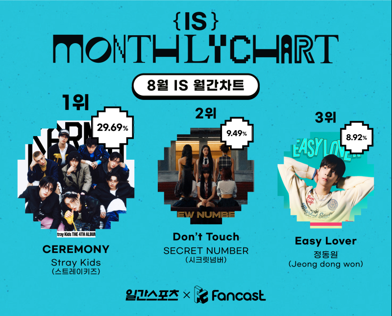 사진=팬캐스트.그룹스트레이키즈의신곡‘세리머니’가팬들의뜨거운지지를받았다.지난8월한달간진행된팬캐스트×일간스포츠‘IS위클리차트’투표에서‘세리머니’가23660표로29.69%를얻어종합1위를차지했다.2위는시크릿넘버의‘돈터치’가7559표로9.49%를,3위는정동원의‘이지러버’가7110표로8.92%를얻었다.1위를차지한스트레이키즈의‘세리머니’는각종음악차트를석권하며글로벌인기를자랑하고있다.실제로‘세레머니’는6일자미국빌보드메인싱글차트‘핫100’에서52위로데뷔하는쾌거를이뤘다.팬들사이에서는독창적인음악색깔과에너제틱한퍼포먼스덕에‘스테이(팬덤명)헌정곡’이라는의견도나온다.2위시크릿넘버의‘돈터치’는강렬한콘셉트로주목을받고있으며중독성있는후렴과강한메시지가인상적인곡이다.3위에오른정동원의‘이지러버’는팝스타일의감성적인트랙으로,정동원의새로운음악색깔을엿볼수있는곡으로주목받고있다.팬캐스트와일간스포츠가공동기획한‘IS위클리차트’는‘2025코리아그랜드뮤직어워즈(KGMA)’의‘베스트리스너스픽’부문과공식적으로연계되어있어,팬들의참여가시상식결과로도반영된다.팬들은매주진행되는투표에참여해자신이지지하는아티스트의차트순위를높일수있으며,월말누적결과는매월공식보도자료를통해발표된다.또한‘IS위클리차트’투표는‘팬캐스트’앱을다운로드한후참여할수있으며,종합1위에게는일간스포츠보도기사,팬캐스트배너,SNS홍보등을제공한다.김지혜기자[email protected]©일간스포츠.무단전재및재배포금지.