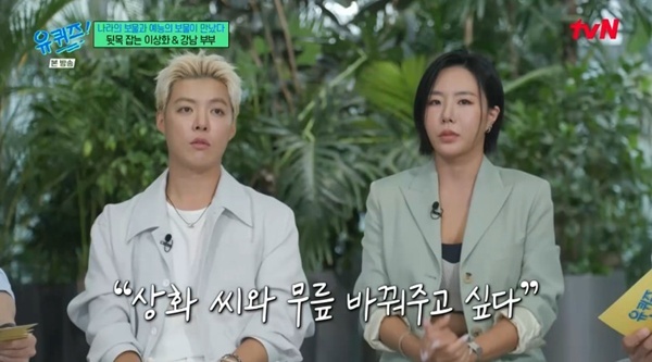 '유퀴즈온더블럭'3일방송tvN'유퀴즈온더블럭'캡처tvN'유퀴즈온더블럭'캡처(서울=뉴스1)박하나기자='유퀴즈온더블럭'강남이아내이상화를위해스포츠마사지자격증을땄다고밝혔다.3일오후방송된tvN예능프로그램'유퀴즈온더블럭'(이하'유퀴즈')에서는결혼7년차를맞은강남,이상화부부가유퀴저로함께했다.강남이은퇴후무릎때문에힘들어하는이상화에게"내무릎과바꿔주고싶다"라며안타까워했다고전해져시선을모았다.훈훈한미담에강남은"차라리제무릎을가져가서상화씨가열심히해서나라를빛내고저는집에서쉬면얼마나좋을까"라고너스레를떨었다.이어강남은결혼후,아내이상화를위해스포츠마사지자격증을곧바로취득했다고밝혔다.강남은"안배운상태로하니까잘안돼서"라며지금은아침에눈을뜨면얼굴옆에이상화의발이있다고고백해웃음을안겼다.한편tvN'유퀴즈온더블럭'은큰자기유재석과아기자기조세호의자기들마음대로떠나는사람여행을담은프로그램으로매주수요일오후8시45분에방송된다[email protected]©뉴스1.Allrightsreserved.무단전재및재배포,AI학습이용금지.