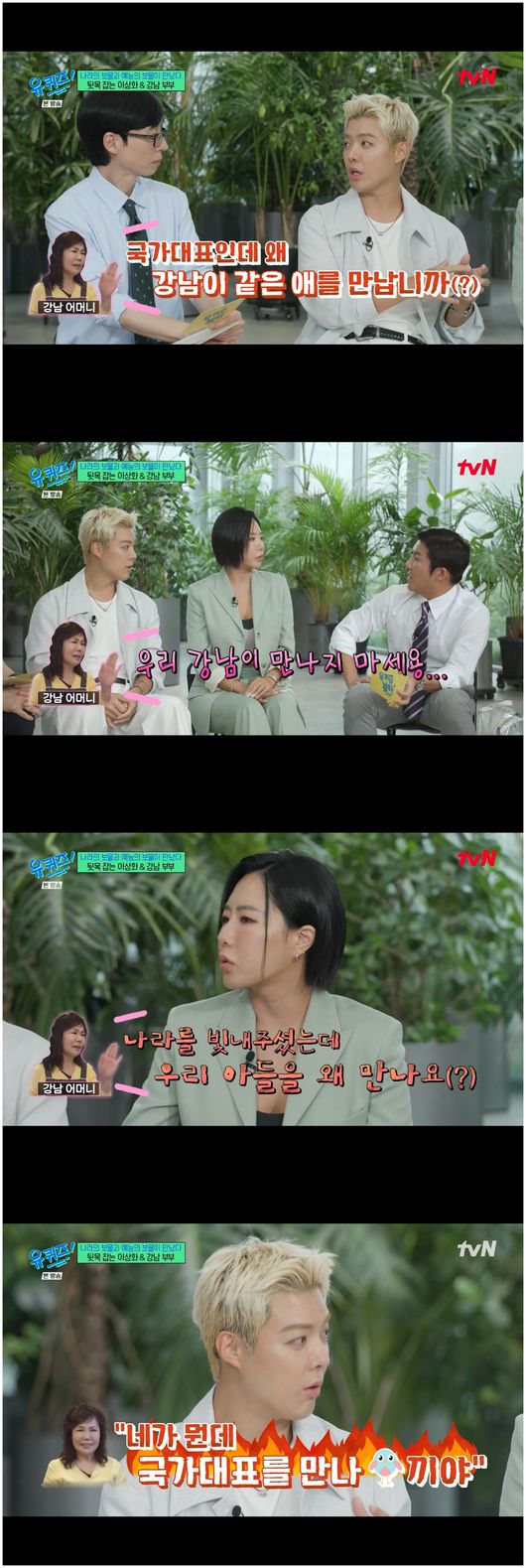 [OSEN=오세진기자]‘유퀴즈온더블럭’결혼7년차부부이상화와강남이결혼전에피소드를밝혔다.3일방영된tvN‘유퀴즈온더블럭’(이하‘유퀴즈’)에서는이상화와강남이등장했다.결혼발표당시두사람의조합에모두의아해했으나,아기자기하게살아가는두사람은어느덧국민적인지지를받는부부로손꼽힌다.결혼전이들은강남의어머니에게반대를당했다.이유는이상화가아깝다는이유였다.이상화는“장난기속에있는진중함,무엇보다어른들한테너무잘한다.예의가진짜바르다”라면서강남의진면목을설명했으나,강남은“어머니께서상화씨에게‘강남이는장난기가심해서결혼하면힘들거다’,‘그리고당신은국가대표인데왜우리아들같은애를만나냐’라고하셨다”라고말했다.이에이상화는“진짜로강남없는데로저를데리고가서‘강남같은애를왜만나냐,당신같은사람이’라면서‘국가를빛내주신당신이우리아들같은애를왜만나냐’라고하셨다”라며강남어머니가자신을너무아꼈다는말을꺼냈다./[email protected][사진채널]tvN채널‘유퀴즈온더블럭’방송화면캡처Copyright©OSEN.무단전재및재배포금지.