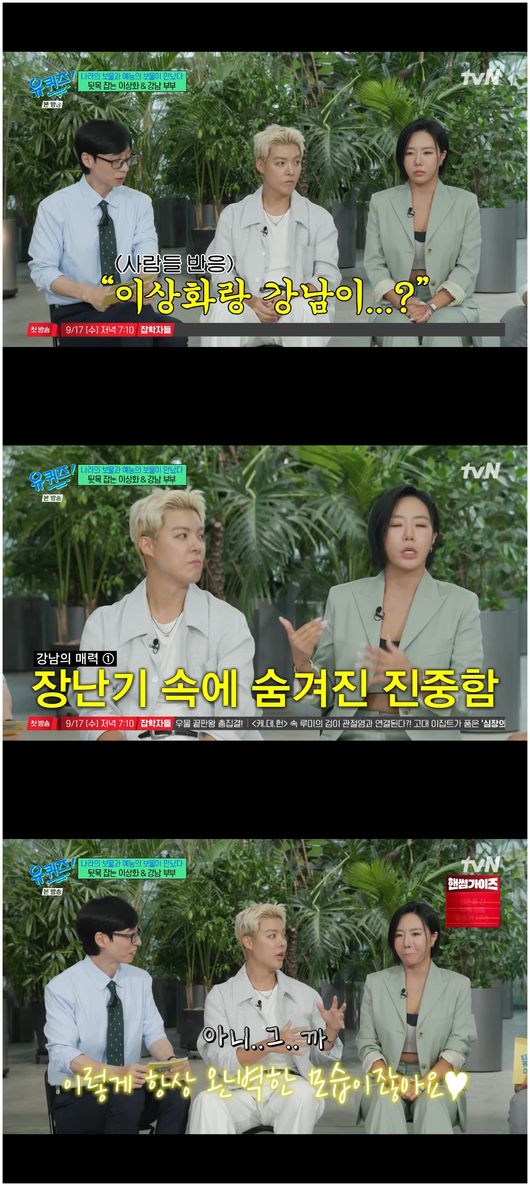 [OSEN=오세진기자]‘유퀴즈온더블럭’강남이이상화의매력에대해자랑했다.3일방영된tvN‘유퀴즈온더블럭’(이하‘유퀴즈’)에서는결혼7년차이상화,강남부부가등장했다.강남의장난기넘치는성격과이상화의쿨한성격이두사람의결합을의아하게만들었지만,두사람은7년째아웅다웅아름다운모습으로살아가고있다.이상화는“장난기속에있는진중함,무엇보다어른들한테너무잘한다.예의가진짜바르다”라며강남에게빠진이유를밝혔다.이에강남은“이상화가피곤해서기절한게귀엽다.평상시는완벽하고멋진모습인데,잠들면되게귀엽다”라고말해모두를깜짝놀라게했다.강남은진지했다.이상화는평상시완벽하며멋지지만,또한편귀여운매력이있다는것이너무나사랑스럽다는것이다.이에모두흐뭇한미소를지었다./[email protected][사진채널]tvN채널‘유퀴즈온더블럭’방송화면캡처Copyright©OSEN.무단전재및재배포금지.