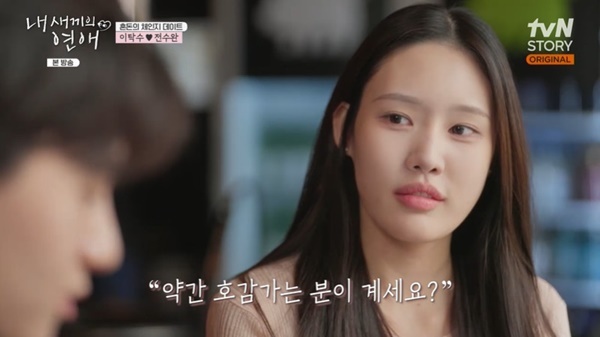 tvNSTORY,E채널‘내새끼의연애’tvNSTORY,E채널‘내새끼의연애’[뉴스엔유경상기자]이탁수가전수완에게호감을표현했다.9월3일방송된tvNSTORY,E채널‘내새끼의연애’에서는이종혁아들이탁수와전희철딸전수완의데이트가성사됐다.남자들의선택으로이뤄진데이트에서이탁수는이철민딸이신향을선택해데이트를했지만도중에상대가체인지됐다.체인지된상대는여자들의원한데이트상대.이탁수는전수완이나타나자“예상못했다”고말했다.전수완은이종원아들이성준과데이트할때는다소무표정했던것과달리이탁수에게는“제가올줄아셨냐.어제첫인상이어떠셨냐”고적극적으로질문했고부친전희철이“쟤가말을잘하네.말을할줄아네”라며놀랐다.츄는“전수완이배낚시때와표정이다르다”고꼬집었다.이탁수는전수완에게“가장기억에남는첫인상”이라며호감을표시했고전수완은“저요?”라며웃었다.이어전수완은이탁수의첫인상에대해“되게친화력이좋아보였다”고말했다.전날전수완은이탁수에게녹음테이프로도호감을표시했던상황.이탁수는음질이좋지않아반신반의하며“전수완같다”고말했고,전수완은“맞아요”라고답하며또웃었다.전수완은“용기를내서표현을했던것같다.호감가진분에게표현을안하면후회가될것같아서표현을했다”고말했다.이에전희철이“표현좀해라.아빠한테도표현해라”고반응해웃음을안겼다.(사진=tvNSTORY,E채널‘내새끼의연애’)뉴스엔유경상yooks@기사제보및보도자료[email protected]ⓒ뉴스엔.무단전재&재배포금지Copyright©뉴스엔.무단전재및재배포금지.