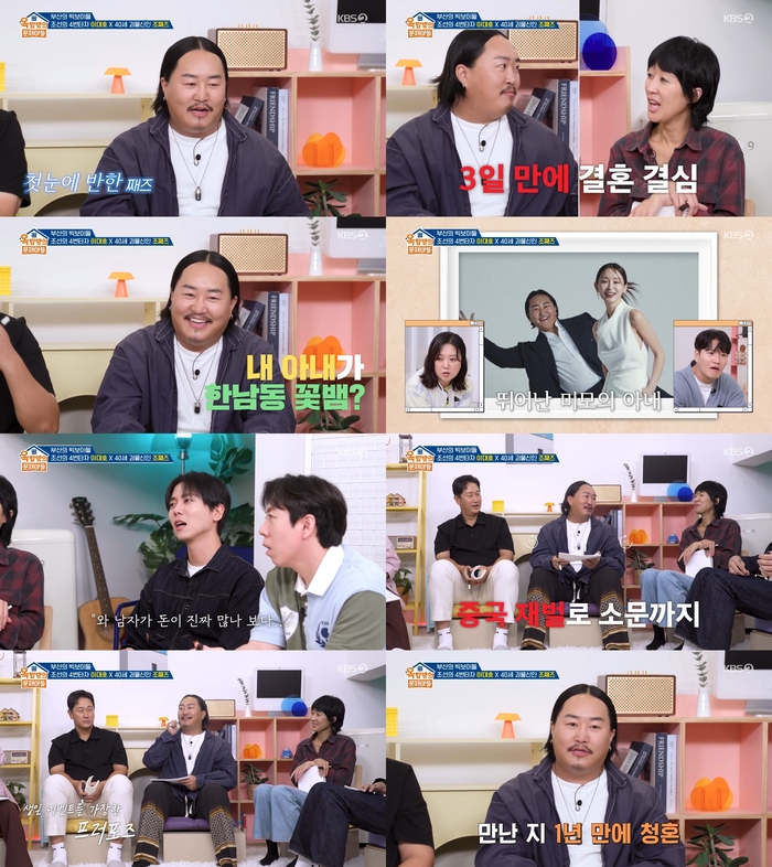 ‘옥탑방의문제아들’.사진IKBS2‘옥탑방의문제아들’방송캡처가수조째즈가아내의미모때문에돈소문에대해이야기했다.4일방송된KBS2‘옥탑방의문제아들’에는이대호,조째즈가게스트로출연했다.이날조째즈는“아내는내가게에손님으로왔다.라이브가있는날이었는데그날따라미인들이많아서너무기분이좋은나머지술을거나하게마시고인사를건넸다.아내가갑자기나를보더니배를만졌다.‘이게뭐지’했는데플러팅이었다”고말했다.이어“얼굴을봤는데너무예뻤다.또이야기를하다보니까‘결혼해야겠다’라는생각이들었다.3일만이었다”고했다.홍진경이“배는왜만졌다고하냐”고묻자조째즈는“약간제주도가면돌하르방코만지는그런느낌아니겠냐.만지면복이있을것같고”라고해웃음을자아냈다.그런가하면조째즈는아내가‘한남동꽃뱀’이라는소문이돈적있다고밝혔다.이어조째즈와아내의사진이공개됐고,이를본김숙은“진짜미녀와야수현실판이다”라고놀랐다.주우재가“‘남자가돈이진짜많나보다’라는반응이있었을것같다”고하자조째즈는“내가중국재벌로소문이났다.깜짝놀랐다”고너스레를떨었다.이어“친구들도다알다보니까자연스럽게소문이사라졌다”고덧붙였다.또한조째즈는프러포즈에대해“처음만나서배만진자리에서프러포즈했다.그날이(아내)생일이었는데깜짝으로준비했다.생일축하하다가마지막에영상이나오면서무릎을꿇고반지를줬다”고말했다.이어“만난지딱1년됐을때프러포즈했다.‘1년연애하니까결혼해도되겠다’라는생각이들었다”고했다.[이세빈스타투데이객원기자]Copyright©스타투데이.무단전재,재배포및AI학습이용금지