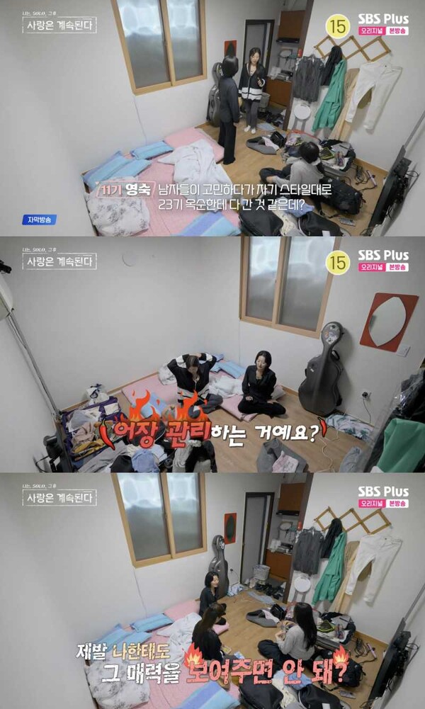 ⓒENA,SBSPlus'나는솔로,그후사랑은계속된다'[스포츠한국신영선기자]'나솔사계'24기옥순이23기옥순에게로쏠린솔로남들의관심에답답함을내비쳤다.4일방송된ENA,SBSPlus'나는솔로,그후사랑은계속된다'에서는23기옥순의인기비결에대해얘기하는11기영숙,23기순자,24기옥순의모습이그려졌다.이날24기옥순은사계데이트권이걸린게임을하고방에돌아와"어떻게돌아가고있는거냐.나,하나도모른다.내가너무안에만있었나?"라며현재상황을물었다.11기영숙은"남자들이고민하다가결국은자기스타일대로23기옥순한테다간것같다"고했고,23기순자는"근데언니가선택을안한다"고말했다.이를들은24기옥순은"어장관리하는거냐"고의심했다.11기영숙은"남자들의새로운매력이계속나타나서"라고돌려말했다.이에24기옥순은"제발나한테도그매력을보여주면안돼?"라고답답해했다.이어23기옥순에게관심있는남자들이누구냐고질문했고,11기영숙은"미스터김빼고다"라고답했다가미스터윤역시23기옥순이아닌25기옥순에게관심이있다고밝혔다.두남자를제외한5명의솔로남들이모두23기옥순에게호감이있다는얘기에24기옥순은"나는다날좋아하는줄알았다"고하더니웃었다.23기순자는"이번에23기옥순이진짜열심히했다"고말했다.11기영숙은"남자들이좋아할것같다"면서23기옥순이달리기를한미스터한에게다가가수고했다고말했다고알려줬다.또"남자들이다애교에약한것같다"면서23기옥순의인기비결로애교를들었다.스포츠한국신영선기자[email protected]©스포츠한국.무단전재및재배포금지.