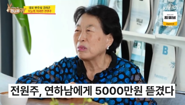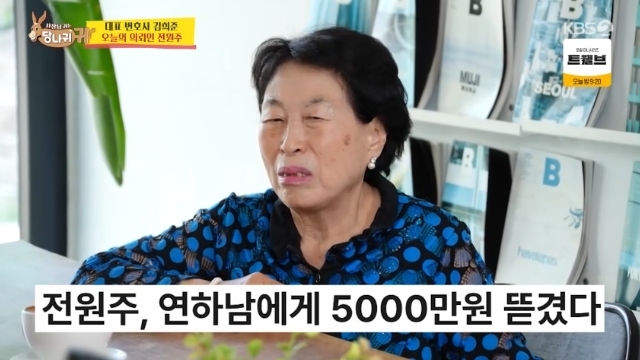 ‘사당귀’.사진lKBS전원주가5천만원을뜯겼다고밝혔다.7일오후방송된KBS2예능프로그램‘사장님귀는당나귀귀’(이하‘사당귀’)에서전원주는김희준변호사를찾았다.이날방송에서전원주는“상속세가많이나오냐”고의뢰했다.이에변호사는“상속세는30억이넘어가면50%가나온다”고답해전원주를놀라게했다.연하남에게5천만원을뜯겼다는전원주는“등산다니다가만났는데잘생겼더라고...나한테누님누님하길래생전처음으로돈을꿔줬죠”라며한숨쉬었다.변호사는“그게가장위험한거예요!이자많이준다?이런투자는다사기예요”라며경각심을일렀다.‘사당귀’는매주일요일오후4시45분KBS2에서만날수있다.[서예지스타투데이객원기자]Copyright©스타투데이.무단전재,재배포및AI학습이용금지