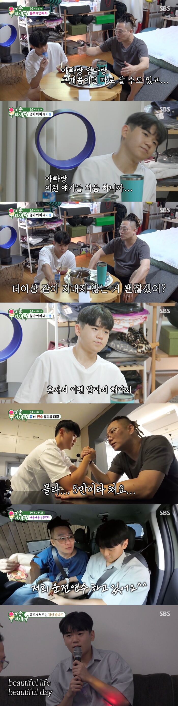 [SBS연예뉴스|김효정에디터]윤후가윤민수를이해하는모습을보였다.7일방송된SBS'미운우리새끼'(이하'미우새')에서는윤민수가아들윤후와시간을보내는모습이그려졌다.이날방송에서윤민수는아들윤후와함께운동을했다.그리고윤후는어린시절좋아했던짜파구리의다른버전인불닭게티를만들어아빠윤민수와함께먹었다.식사를하던중윤민수는곧다시미국으로떠나는아들을아쉬워했다.그리고그는"다음에한국에올땐엄마랑아빠랑어떻게될지몰라,따로살수도있어.그땐지금처럼계속같이못있는다"라며"네가엄마네갈지아빠네올지모르니까"라고말했다.이에윤후는"이런얘기를아빠를처음하니까"라며당황했다.조심스러운윤후에윤민수는"이럴때아니면언제하냐.너도바쁘고나도바쁘고"라며편안하게말하라고했다.그리고윤민수는"아빠랑엄마가더이상같이지내지않는거괜찮겠어?"라고단도직입적으로물었다.그러자윤후는"예뭐생각보다괜찮은것같다"라고말해윤민수를안도하게했다.이어윤후는"이제혼자서알아서해야지.학교도잘다니고이제다컸으니까괜찮다"라며윤민수를안심시켰다.윤민수는앞으로계속함께할수는없는아들에대해"너없으면나심심하단말이야"라며서운함을드러냈다.이에윤후는"노는건아빠랑놀거야"라며안심시켰다.그러면서그는"지내는건엄마랑지내고"리며"아빠집에서놀고엄마집에서자는거지"라고말했다.그러자윤민수는"그건안되지,자고갈땐자고가야지"라고말해눈길을끌었다.그리고윤민수는"다음에네가올땐아빠가집이생길지안생길지모르겠는데아빠집이생기면네방을만들어놓을거다.어떻게하면좋겠냐?"라고물었다.딱히생각을안해봤다는윤후에윤민수는"바느낌으로만들까?네친구들놀러와도먹을수있게.친구들오면아빠가바텐더도하고노래도불러주고이러면어떻겠냐?"라고물었다.그러자윤후는"괜찮은데?아빠가그래주면좋지"라며윤민수에장단을맞춰주는어른스러운모습을보여보는이들을감탄하게만들었다.그리고이날방송에서는윤민수가윤후와함께팔씨름을하고노래방에가는모습도공개됐다.또한도로주행연수를하는너무커버린윤후의모습이모두를놀라게했다.Copyright©CopyrightⓒSBS.Allrightsreserved.무단전재,재배포및AI학습이용금지