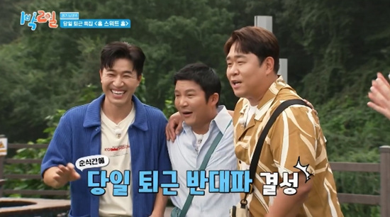 (엑스포츠뉴스원민순기자)김종민이유부남이된후당일퇴근소식에난색을표했다.7일방송된KBS2TV'1박2일시즌4'에서는김종민,문세윤,조세호,이준,딘딘,유선호의경기도여행기가전파를탔다.이날멤버들은데이식스와의강원도여행이후남양주에서모여오프닝을진행했다.이준은촬영당일교통체증을우려해일찍출발했다가제작진보다일찍출근한사실이드러나웃음을자아냈다.딘딘은데이식스멤버들에게연락이왔는데김종민을롤모델로꼽았던도운이쌩쌩하다면서김종민이없을때대타로불러도될것같다고말했다.주종현PD는멤버들에게이번여행의베이스캠프가여의도KBS라고말해궁금증을자아내더니여행콘셉트가당일퇴근이라고공지했다.주종현PD는당일퇴근을못하는경우에는지독한밤이기다리고있다는경고도덧붙였다.딘딘을비롯해멤버들이당일퇴근가능성에좋아하는가운데유부남멤버들의안색이어두워졌다.김종민은당일퇴근이안될것같다고했다.조세호역시"나온김에하루자고가자"고말했고문세윤도동참하면서당일퇴근반대파가결성됐다.김종민은"오늘장모님오신다고하셨다"는얘기를했다.미혼멤버들은그러면자신들의자리를뺏지말라고말했다.김종민은그래도장모님을뵙기는해야한다면서미혼멤버들에게그냥당일퇴근권을내줄수는없다고했다.문세윤은다음장소로이동하는버스안에서김종민과조세호에게아내들한테당일퇴근가능성을말했는지물어봤다.김종민과조세호모두아직말을안했다고했다.문세윤은자신도하지않았다고했다.조세호는자신의경우신혼이라서아내와함께하는시간이좋기는하다고말했다.문세윤은조세호의말에발끈하면서"나도16년차밖에안됐다.연애까지합치면23년밖에안됐다"고했다.조세호는당일퇴근에대해1박2일동안의촬영이감사한일이지만체력적으로힘들수있다보니까너무달콤하다고했다.당일퇴근이나오면가장좋아하는딘딘은당일퇴근을개교기념일로비유했다.딘딘은개교기념일이공짜휴일아니냐면서자신의능력으로딸수있다면포기하고싶지않다고의욕을드러냈다.문세윤도당일퇴근을하면늦게끝나도선물같은하루가될수있다고전했다.사진=KBS방송화면원민순기자[email protected]©엑스포츠뉴스.무단전재및재배포금지.