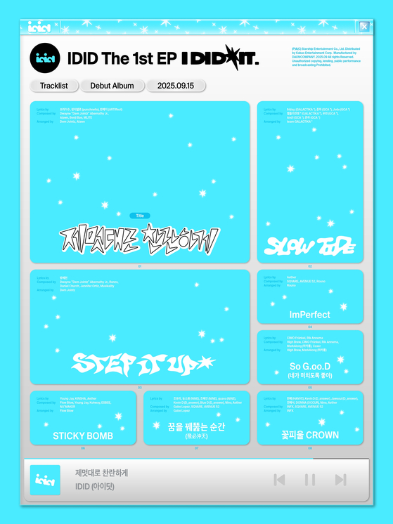 스타쉽의초대형프로젝트'데뷔스플랜(Debut'sPlan)'을통해탄생한뉴보이그룹아이딧(IDID)이'하이엔드청량돌'로서확고한정체성을드러낼데뷔타이틀곡을확정하며팬들의기대를증폭시키고있다.스타쉽은지난7일아이딧(IDID·장용훈,김민재,박원빈,추유찬,박성현,백준혁,정세민)의첫번째미니앨범'아이디드잇.(Ididit.)'의트랙리스트를공개했다.아이스블루무드의스킨으로이뤄진트랙리스트는음악재생프로그램의팝업창느낌으로하이틴감성을채워세상에서단하나뿐인아이딧(IDID)만의청량미를완성했다.아이딧(IDID)스토리의정식첫페이지를장식할데뷔타이틀곡은'제멋대로찬란하게'로확정됐다.자유롭고에너지넘치는아이딧만의감성이직관적으로드러난제목처럼하이엔드청량돌을표방한아이딧(IDID)의정체성을대표하는타이틀곡으로손색이없을것으로기대를모으고있다.아이딧(IDID)의첫인상과다름없는타이틀곡'제멋대로찬란하게'가케이팝팬들의마음을어떻게사로잡을지도흥미를자극한다.타이틀곡외에도하이틴힙합장르인프리데뷔곡'STEPITUP'을비롯해'SLOWTIDE','ImPerfect','SoG.oo.D(네가미치도록좋아)','STICKYBOMB','꿈을꿰뚫는순간(飛必沖天)','꽃피울CROWN'등총8곡이트랙리스트에담겨있다.닥터드레(Dr.Dre),에미넴등세계적인팝스타들과제니의'ExtraL',에스파의'Supernova',NCT127의'CherryBomb','영웅(英雄;KickIt)'등케이팝아티스트들의음반에참여한미국프로듀서뎀조인츠(DemJointz)를비롯한글로벌프로듀서들이참여해완성도를높였다.8곡중'ImPerfect','SoG.oo.D(네가미치도록좋아)','STICKYBOMB','꿈을꿰뚫는순간(飛必沖天)','꽃피울CROWN'5곡은아이딧(IDID)의탄생을있게한스타쉽의초대형프로젝트'데뷔스플랜(Debut'sPlan)'에서무대가공개돼케이팝팬들에게도익숙한곡들로채워졌다.아이딧(IDID)이들려주는색다른느낌은어떨지기대를모으고있다.아이딧(IDID)은'데뷔스플랜(Debut'sPlan)'에서노래,춤,표현력,소통능력등다방면으로올라운더실력을빛낸완성형아이돌로,본격데뷔전생방송무대와프리데뷔무대,해외무대등다양한경험을쌓으며준비된초대형신인으로관심을받고있다.전곡이타이틀곡이라해도손색이없을만큼데뷔앨범완성도를높인아이딧(IDID)이5세대아이돌시장에일으킬신선한바람에기대감이높아지고있다.아이딧(IDID)은15일오후6시각종온라인음원사이트를통해타이틀곡'제멋대로찬란하게'가포함된첫번째미니앨범'아이디드잇.(Ididit.)'을발매한다.김선우엔터뉴스팀기자[email protected]사진=스타쉽엔터테인먼트Copyright©JTBC.무단전재및재배포금지.
