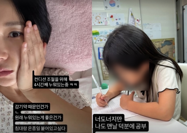 [OSEN=임혜영기자]가수이지혜가컨디션난조에도딸의공부를책임져눈길을끈다.이지혜는9일개인채널에“목감기로목소리가안나와”라는글과함께병원을찾은모습을공개했다.이지혜는곧침대에누워있는모습과함께“컨디션조절을위해4시간째누워있는중”,“감기약때문인건가.원래누워있는게좋은건가.침대랑온종일붙어있고싶다”라며컨디션난조를겪고있다고밝혔다.그러나두아이의엄마인이지혜는마음편히쉴수없었다.아이들을돌봐야하기때문.특히이지혜는사립초등학교에다닌다는큰딸의공부를옆에서봐주며“너도너지만나도맨날덕분에공부”,“받아쓰기연습”이라며‘열혈맘’의모습을보였다.한편이지혜는세무사문재완과결혼해슬하에두명의딸을두고있다.이지혜는큰딸이연간학비약1200만원에달하는사립초등학교에다닌다고밝힌바있다./[email protected][사진]이지혜개인채널Copyright©OSEN.무단전재및재배포금지.