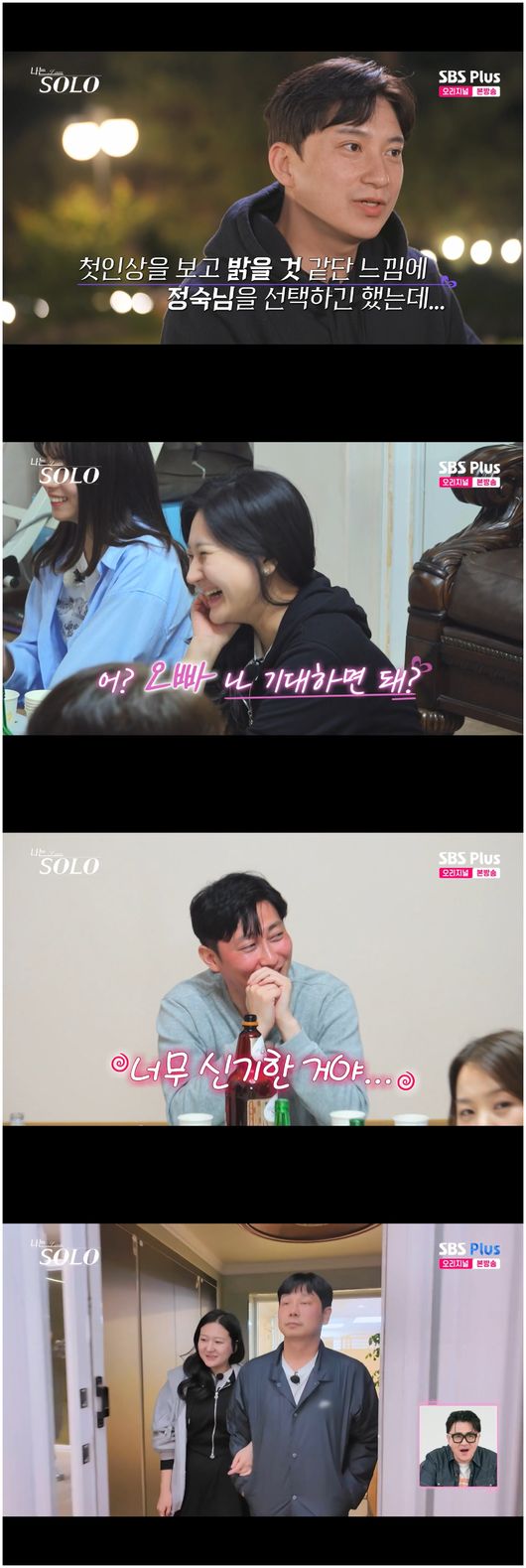[OSEN=오세진기자]‘나는솔로’28기돌싱특집정숙이술자리에서온갖호칭을붙인가운데,영수가정숙의선택을받았다.10일방영된SBS예능‘나는SOLO-나는솔로’(이하‘나는솔로’)에서는첫인상선택후첫저녁술자리가펼쳐졌다.조용해보이던영수는리드하는모습을보이며첫인상선택이달라지는듯했다.이어차분하면서도미소를잘짓던정숙은술이들어가자다른모습이보였다.정숙은“저는상철이랑영수선택중에고민했다.상철이랑별로차이는없었다.한끗차이로어긋난거같았다”라며영수에대한아쉬움을뽐냈다.이어정숙은“오빠!”,“야!너의사냐?너의외다?”,“야,너공대냐?”라며영호,상철,영수에게시원하게말을놓았다.급기야옥순에게도"너"라고말해옥순을놀라게한정숙.영호는그런정숙을보며어안이벙벙해졌다.영호는“첫인상을보고정숙이밝을거같아서선택했는데,옥순과정숙호감도가차이가없었다.오늘정숙이술자리에서에너지가높아지는걸보면서,이게나중에감당할수있을까,자연스럽게옥순을알아가보자싶었다”라며조용히마음이달라졌다는걸고백했다.그러나이런정숙에게빠진사람이있었다.바로영수였다.정숙은영수에게대화를신청했고,오빠라고부르며영수와팔짱을끼고손깍지를끼고나가MC들을기겁하게만들었다./[email protected][사진출처]SBS예능‘나는솔로’방송화면캡처Copyright©OSEN.무단전재및재배포금지.