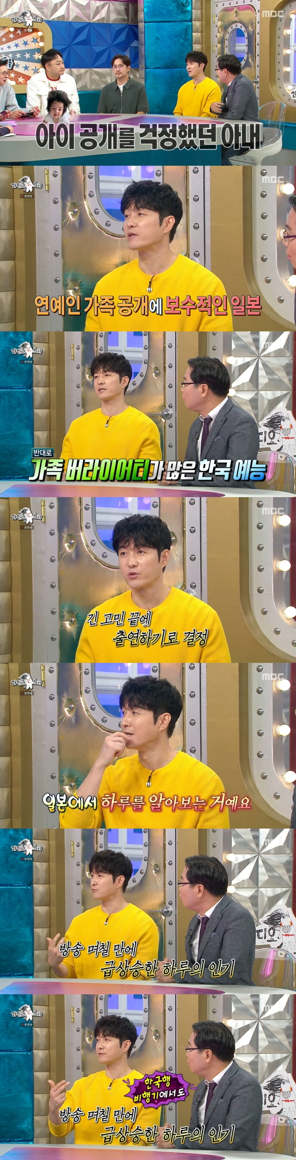 사진=MBC[스포츠투데이김태형기자]배우심형탁이방송출연이후아들하루의인기를자랑했다.10일방송된MBC'라디오스타'에는'마음은부자아빠몸은가난한아빠'특집으로김수용,임형준,심형탁,부동산컨설턴트김인만이출연했다.이날유세윤은"심형탁씨가아빠가된후제2의전성기를살고계신다"고말했다.김구라는심형탁의아들을언급하며"아기머리가숱이엄청많더라"라고전했다.심형탁은"'슈퍼맨이돌아왔다'에출연했는데3개월동안최고시청률이더라.순간시청률도5%이상"이라고자랑했다.이어"아이를공개할때아내가걱정을많이했다.일본연예인들은가족공개를잘안한다.그런데한국예능은가족버라이어티가많다.실생활을많이보여주지않나.그러다보니까본인이나오는것도처음에이해를못했다.첫방송할때일본의처가에가있었다.그런데며칠지나니까일본사람들이하루를알아보더라.처가쪽으로와서사진찍고가고그랬다.집에오는비행기에서도하루만봤다"며인기를실감했다.특히심형탁아들하루는풍성한머리숱으로화제를모았다.김구라는"머리말리는데20분걸리지않냐"고물었고,심형탁은"10분은걸린다"고답했다.한편심형탁은지난2023년18살연하일본인히라이사야와결혼했다.지난1월아들하루를품에안은그는현재KBS2'슈퍼맨이돌아왔다'를통해육아일상을공개하고있다.[스포츠투데이김태형기자[email protected]]Copyright©스포츠투데이.무단전재및재배포금지.