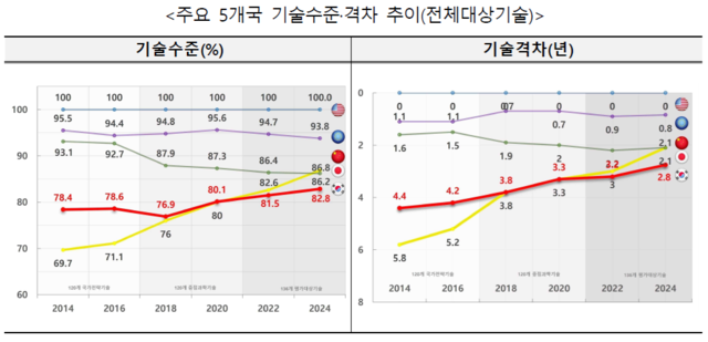 11대중점기술美대비83%…中보다4%p↓이차전지는2022년1위서中에역전허용반도체·디스플레이·TV도중국이턱밑추격“양자·로봇등AI기술안보정책대응필요”한국의이차전지기술력이중국에역전당했다는평가가나왔다.디스플레이,반도체,TV등이분야에서중국에게턱밑추격을받고있는가운데,이차전비분야에서도역전을허용해인공지능(AI)주도권확보를위한첨단분야중심의정책적대응이필요하다는제언이나온다.22일과학기술정보통신부가국가과학기술자문회의에최근보고한‘2024년도기술수준평가결과안’에따르면최고기술보유국인미국과비교해한국의2024년기술격차는2.8년으로중국의2.1년과비교하면0.7년차이가났다.한국은중국에2022년처음으로추월당한이후0.2년차이가났지만,이번조사에서0.5년더벌어졌다.기술수준평가는건설·교통,재난안전,우주·항공·해양,국방,기계·제조,소재·나노,농림수산·식품,생명·보건의료,에너지·자원,환경·기상,정보통신기술(ICT)·소프트웨어(SW)등11대분야중점과학기술을대상으로2년마다실시한다.평가결과에따르면전체기술수준은최고기술보유국인미국을100%로봤을때유럽연합(EU)93.8%,중국86.8%,일본86.2%,한국82.8%순으로평가됐다.한국의미국과비교한기술격차가가장멀다는뜻이다.2024년도기술수준평가결과안보고서.과학기술정보통신부제공국가전략기술50개수준을평가한결과에서도미국과비교해한국의격차는2.6년,중국은1.4년으로중국의약진이두드러졌다.한국은2022년3년에서0.4년줄였지만,중국은이기간0.8년을줄이며전략기술격차를빠르게줄여나갔다.이중2022년한국이유일하게1위를점유했던이차전지분야는당시0.9년격차가났지만,2024년에는중국이한국을역전해1위에올랐다.한국은중국과0.2년격차를보였다.이와같은중국에대한역전허용은이차전지뿐이아니다.디스플레이의경우LCD를중심으로중국이점유율측면에서한국을앞선가운데,반도체의경우도중국이턱밑까지쫓아왔다는평가가나온다.한국과학기술기획평가원(KISTEP)이작년2월발간한‘3대게임체인저분야기술수준심층분석’에서는작년기준한국의반도체분야기술기초역량이모든분야에서2022년조사대비중국에역전당한것으로나타났다.여기에는고집적·저항기반메모리,차세대고성능센싱,고성능·저전력AI반도체기술분야등이포함된다.현재중국은AI반도체시장에서도강력한도전자로올라서고있다.시장조사업체옴디아에따르면작년2분기매출기준글로벌D램시장점유율은CXMT가2.3%로빅3에이어4위를차지하는등‘글로벌4강’에안착한모습이다.업계에서는CXMT의점유율을현재5%수준까지추정하고있다.CXMT의경우고대역폭메모리(HMB)뿐아니라LPDDR5X등차세대D램제품서도기술개발에열을올리고있다.‘2024년도기술수준평가결과안’보고서.과학기술정보통신부제공TV시장은점유율부문서사실상비등해졌다는평가마저나온다.시장조사업체카운터포인트리서치에따르면,출하량기준삼성전자는시장점유율15%로1위를유지했고중국TCL이13%,하이센스가12%로뒤를이었다.이런가운데중국TCL이일본소니TV사업부와합작사를설립하기로하면서올해는판도가뒤바뀔수있다는관측이나온다.삼성전자가소니아성을무너뜨리고TV시장1위에올라선사례가재현될수있다는경고다.배경훈과학기술정보통신부장관은‘2024년도기술수준평가결과안’보고서에서“기술주기가급격히짧아짐에따라기술강국지형도변하고있다”며“전략기술확보가국가안보와산업경쟁의핵심축으로작용할것”이라고진단했다.이어“기초기반역량확보와응용분야등한국의강점을극대화할수있는정책적대응필요하다”며“AI기술은양자,로봇,첨단바이오등전략기술향상에가속화엔진으로작동할것으로예상돼대응이필요하다”고밝혔다.장우진기자[email protected]©디지털타임스.무단전재및재배포금지.