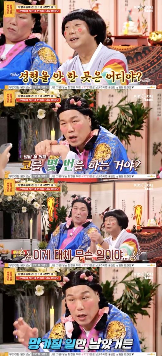 [OSEN=임혜영기자]중독수준의성형을하는사연자가나타났다.15일방송된KBSJoy‘무엇이든물어보살’(이하물어보살)에는얼굴성형에만1억원을들였다는사연자가등장했다.이수근은“성형을안한곳이어디냐”라고물었고,사연자는“두상과손,발안했다”라고말했다.이어“코는200만원,앞트임과쌍수는110만원,지방흡입330만원들였다.엄마카드훔쳐서앞트임복원200만원,23살에눈과코를재수술해서550만원,이중턱지방흡입”이라고말한후성형한부분을일일이나열했다.이를듣던서장훈“코를몇번을했냐”라고답답해했고,이수근은“냄새는맡냐”라고말했다.두사람은과거사진을보여달라고말했고,사진을본이수근은“고민은됐었겠다”라고직언해웃음을자아냈다.서장훈은성형을시작한이유를물었다.그는“중학교때외모에관심이없었다.좋아하던남학생이제다리를보고족발같다고했다.뚱뚱하니까”라고말했다.이어“충격이돼서3개월동안12kg을뺐다.살이빠지기시작하니까얼굴이보이더라.엄마한테쌍꺼풀수술을부탁했다.처음으로수술을하고검정고시도합격을했다.항공운항과에갔는데다키가크고예쁘더라.교수님도저보고코(수술을)하라고”라고말했다.사연자는자신의유학생활로인해형편이기울었다고밝히면서도엄마의도움을받아성형을이어갈수있었다고밝혔다.사연자는병원에서도성형을그만하라는제안을받았다고.사연자는또성형이하고싶다고말했고,서장훈은“헛소리하지마라.여기까지한계다.여기서멈추질않으면진짜로망가질일만남았다.지금네가말을할때나표정이자연스러워보이냐.부자연스럽다.발음도부자연스럽다.수술했다는얘기를안해줘도다알정도다.얼굴표정도자연스러운게하나도없다”라고일침을가했다.서장훈은“손을또대면그때부터스스로를망가뜨리게되는것이다.관리를계속하고싶다면피부관리에서끝내라”라고덧붙였다.이수근은“열심히일해서또다른모습을찾아라.스스로를사랑해라”라고말했다./[email protected][사진]KBSJoy‘무엇이든물어보살’Copyright©OSEN.무단전재및재배포금지.