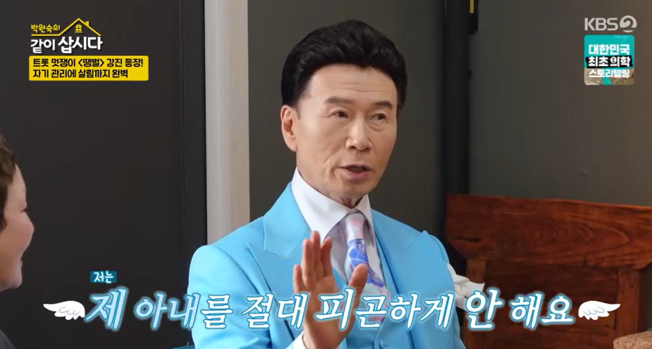 KBS2TV‘박원숙의같이삽시다’KBS2TV‘박원숙의같이삽시다’KBS2TV‘박원숙의같이삽시다’[뉴스엔하지원기자]가수강진이자기관리끝판왕면모를드러냈다.9월15일방송된KBS2TV'박원숙의같이삽시다'에서는혈관건강체크에나선식구들의모습이전파를탔다.게스트로는트로트가수강진,나상도가출연했다.강진은멋스러운하늘색수트를입고등장,동안비주얼을과시해식구들을놀라게했다.70세인강진은깐깐한식단관리로체형을유지하는근황도밝혔다.더불어살림왕인강진은"내가깔끔을떠니까'부인을너무피곤하게하는거아니에요?'라고하는데깔끔떨어도내가떨지아내는절대피곤하게하지않는다"고털어놨다.뉴스엔하지원oni1222@기사제보및보도자료[email protected]ⓒ뉴스엔.무단전재&재배포금지Copyright©뉴스엔.무단전재및재배포금지.