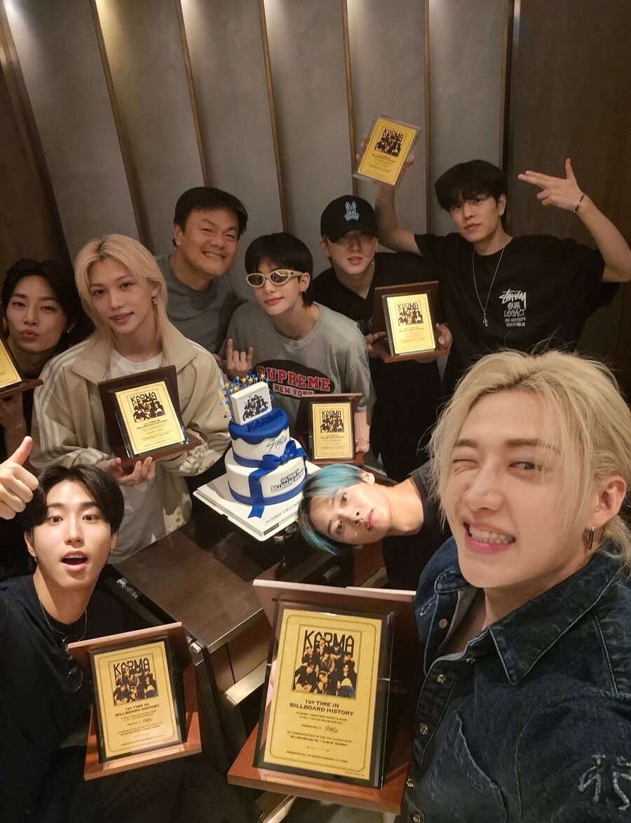 ▲박진영,스트레이키즈.출처|스트레이키즈SNS[스포티비뉴스=정혜원기자]JYP엔터테인먼트대표프로듀서박진영이빌보드에서대기록을세운소속그룹스트레이키즈에게특별한금을선물했다.15일스트레이키즈는공식SNS에"피디님고맙습니다"라는글과함께사진을여러장게재했다.공개된사진에는박진영과스트레이키즈멤버들이환하게웃으며함께사진을찍고있다.8명의멤버들은박진영이선물해준순금액자를하나씩들고포즈를취하고있어눈길을끌었다.스트레이키즈는최근발매한정규4집'카르마'로또한번'빌보드200'차트1위에올랐다.이는해당차트70년역사를통틀어최초로7연속1위에오른기록으로,스트레이키즈는국내를넘어해외에서도유의미한기록행진을이어가고있다.박진영은빌보드차트에서최초기록을세운스트레이키즈를축하하기위해멤버전원에게각각금을선물한것으로보인다.▲박진영,스트레이키즈.출처|스트레이키즈SNS특히해당금은한개당75g으로,약20돈에달하며,멤버들이받은8개의액자를합치면무려순금160돈이다.17일기준순금160돈의가격은약1억280만원이다.이처럼박진영이스트레이키즈를위해통큰선물을하자많은누리꾼들이놀라움을드러냈다.한편스트레이키즈는오는10월18일,19일양일간인천아시아드주경기장에서'스트레이키즈월드투어'도미네이트:셀레브레이트'를열고투어대장정의막을내린다.박진영은최근대통령직속대중문화교류위원회공동위원장으로내정됐다.▲박진영이스트레이키즈에선물한금.출처|스트레이키즈SNS<저작권자ⓒSPOTVNEWS.무단전재및재배포금지>Copyright©스포티비뉴스.무단전재및재배포금지.