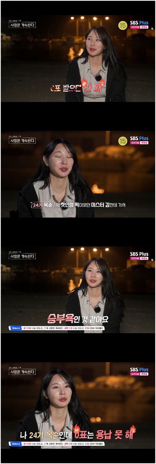 [OSEN=오세진기자]‘나는SOLO,그후사랑은계속된다’24기옥순은역시나불굴의아이콘이었다.18일방영한ENA,SBSPlus예능‘나는SOLO,그후사랑은계속된다’(이하‘나솔사계’)에서는지난주이어슈퍼데이트권에서도만족하지못한24기옥순이철두철미하게나가는모습을보였다.그는미스터권에게슈퍼데이트권을써달라는요청을받았으나오히려미스터권의마음은23기옥순에게로더강렬해졌다.돌아온24기옥순을기다린건미스터나였다.지난주거의분량실종에가까웠던그는이번회차에서솔로여성과남성들의고민을들어주며여유롭게시간을만끽하고있었다.그러나틈을놓치지않고그는24기옥순에게"네가마음에든다"라며진지하게돌직구를던졌다.윤보미와데프콘은“24기옥순이지칠타이밍에저렇게와서”라며깜짝놀랐다.한편미스터김은23기순자의거절을받아들인후24기옥순과대화를하며첫인상선택에대한이야기를나누었다.24기옥순은재빨리"저에게데이트권을써주실수있냐"는질문을던져답을구했다.데프콘은"미스터나에게집중좀해보지"라며아쉬워했다.24기옥순은“뭔가남자가또선택할거같았다.그랬더니흑화했다.0표를또받을수없었다.미스터김님이첫인상픽이라,대화를해봤다”라면서“승부욕이있는거같다.나그래도24기옥순인데0표는못받는다”라며자신의속마음을밝혔다./[email protected][사진출처]ENA,SBSPlus예능‘나는SOLO,그후사랑은계속된다’Copyright©OSEN.무단전재및재배포금지.