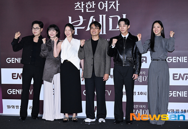 왼쪽부터서현우,주현영,장윤주,박유영감독,진영,전여빈전여빈진영왼쪽부터전여빈,진영서현우장윤주주현영[뉴스엔글장예솔기자/사진유용주기자]'착한여자부세미'가ENA드라마역대최고시청률을노린다.9월22일오후서울영등포구CGV영등포에서지니TV오리지널드라마'착한여자부세미'(극본현규리/연출박유영)제작발표회가진행됐다.이자리에는박유영감독,전여빈,진영,서현우,장윤주,주현영이참석했다.'착한여자부세미'는인생리셋까지카운트다운3개월,한방을꿈꾸며시한부재벌회장과계약결혼을감행한흙수저여자경호원이막대한유산을노리는이들을피해3개월간신분을바꾸고살아남아야하는범죄로맨스드라마.극중전여빈은가성그룹오너의경호원김영란을연기한다.돈때문에비참한인생을살아온흙수저출신이지만,가성그룹회장가성호(문성근)로부터엄청난재산과함께복수까지상속받는가상인물'부세미'를통해또다른삶을맞이한다.진영은시골에서딸기농사를지으며씩씩하게아들을키우는싱글대디전동민으로분한다.서현우는돈을위해서라면수단과방법을가리지않는가성그룹회장전담개인변호사이돈역을,장윤주는가성그룹오너의붓딸이자유산받을날을하염없이기다리는욕망의화신가선영역을,주현영은가성그룹오너일가저택에서도우미로일하는백혜지역을맡아강렬한존재감을드러낸다.'유괴의날'을통해시청률과화제성을모두잡았던박유영감독은'착한여자부세미'에대해"복합장르의드라마다.범죄,로맨스,휴먼,코미디가조화롭게감미된드라마"라고소개했다.데뷔후첫타이틀롤을맡게된전여빈은"타이틀롤을처음맡았다는생각을따로하진않았다.'또좋은캐릭터를만나게됐구나'하는느낌이었다"며"타이틀롤이라는기사가많이난후에더책임감을가져야하는자리라고생각했다.현장에서도모든분들이더큰책임감을갖고임해주셔서타이틀롤이라는생각이들진않았다.물론책임감은배로갖고있지만더기쁘게,더순수하게,여지껏그래왔던것처럼작품에임했다"고힘주어말했다.전작'우리영화'때와상반된캐릭터.전여빈은"대본을읽었을때로그라인에'너는너자체로서행복해질자격이있다'는뉘앙스의글이적혀있었다.제마음을흔들었고,작품선택하기전에그글을따로메모해놓을정도였다.감독님을만나자마자너무하고싶다는욕심을정제없이드러내게되더라.희망한톨없었던김영란이부세미라는삶을만나게되면서그간중요하게여겼던것들이전환된다.그런것들이드라마적으로잘보여지고,외적으로도두가지표현이가능한작품이었기때문에욕심이많이났다"고전했다.경호원으로서액션연기에도도전한다.전여빈은"영란에게총이중요한도구로나온다.제가다행히몇년전영화'낙원의밤'에서사격연습을열심히했다.총소리를두려워하지도않고,반동도안무서워한다.그도움을많이받았다.또경호원으로서의액션은무술감독님과대역을해주신액션배우님들께서많은도움을주셨다.제게주어진액션을온악을다바쳐서하는게제가할수있는최선이었다"고이야기했다.진영은싱글대디캐릭터에대해"엄청난도전이었다.아빠가되어보지않아서부성애가어떤지상상이안됐다"고밝혔다.이어"어렸을적아버지모습을가장많이떠올렸다.또감독님께서너무자상한분이시더라.감독님의모습를참고하기도했다"면서"같이함께한아들배우가연기를너무잘한다.오히려아이의연기를보면서제가더집중하고정신차릴수있었다"고털어놨다.전여빈과진영은다소어두울수있는드라마에서달콤한로맨스를선보인다.호흡을묻자전여빈은"진영씨는대사보다눈빛을통해많은이야기를주는데잘받으면서연기할수있었다.촬영하다제가실수를많이했던대사가있었는데그때진영씨가저의실수를부끄럽지않도록받아들여주더라.먼저'누나내가좀더집중해볼게'해주는데이런게진짜상대배우에게해줄수있는위로,격려라고생각했다"고고마움을표했다.이어진영은"사람한테서풍기는에너지와느낌이있는데여빈누나를보면그냥다좋다.에너지를얻을수있고,긍정적으로해낼수있는힘을준다.연기뿐아니라여러가지로많이배운드라마인것같다"고화답했다.장윤주의소시오패스연기는작품의가장큰관전포인트."파격변신"이라는말에장윤주는"전작과비교해보면다른캐릭터라파격변신이라고볼수있지만제기준에선아직아니다.아직남아있다"고밝혔다.장윤주는"일단이대본을받았을때되게재밌었다.'가선영역할을과연할수있을까?'부담은당연히됐다.매작품이그런것같다.'끝까지내가이걸완주할수있을까?'이런고민들을하는데가선영캐릭터는조금더고민되고부담돼서더많이준비했던것같다"고털어놨다."TMI지만모든촬영이끝나고나서울었다"고고백한장윤주는"'베테랑'이라는영화가2015년에개봉해서딱10년이됐다.그작품이후이렇게캐릭터에연민과애정을가진적이있었나싶더라.극을보시면'어떻게저런연기를하고울었지?'할수있지만저는가선영을이해하고사랑한다.그래서집에서혼자펑펑울었다"고캐릭터를향한애정을드러냈다.기대하는시청률을묻자가장먼저박유영감독은"입소문만잘난다면10%까지는가보고싶다"고포부를밝혔다.장윤주는"시청률은우리의영역이아니"라면서도"갖고있는바람은'이상한변호사우영우'를이기고싶다"고전했