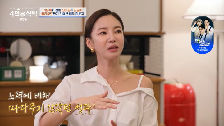 '4인용식탁'22일방송채널A'4인용식탁'캡처(서울=뉴스1)이지현기자=김윤지가가수NS윤지활동시절을떠올렸다.22일오후방송된채널A'절친토큐멘터리4인용식탁'(이하'4인용식탁')에서는인플루언서겸배우기은세가주인공으로나온가운데동료김윤지,신다은등을집에초대했다.이자리에서MC박경림이김윤지를향해"신인때'여자비'로불리지않았나?"라고물었다.김윤지가고개를끄덕이며"'제2의손담비'로도불렸던기억이난다"라고답했다.특히김윤지는"(가수활동이)뭔가항상내목표치보다못미치는성과였다.만년2~3등이었던것같다"라면서속내를고백했다.채널A'4인용식탁'캡처아울러"모든걸해탈하고지금회사에들어갔다.우연히회사에서(기은세)언니를마주쳤다.언니한테(할리우드영화'리프트')이런오디션이들어왔다고말하니까,'무조건찍어'하면서뭘입어야할지도알려줬다"라는등오디션뒷이야기를전했다.김윤지가"오디션기한이임박해서바로촬영해야했던상황이었는데,언니가조언한대로민소매상의에청바지를입고6시간촬영해서보냈다.그런데그게된것"이라고해놀라움을안겼다[email protected]©뉴스1.Allrightsreserved.무단전재및재배포,AI학습이용금지.