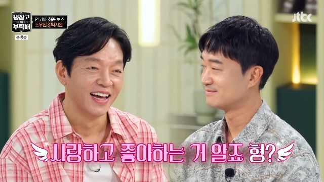 JTBC‘냉장고를부탁해since2014’캡처JTBC‘냉장고를부탁해since2014’캡처[뉴스엔서유나기자]배우박지환이노안은셀프인정했다.9월28일방송된JTBC예능'냉장고를부탁해since2014'(이하'냉부')41회에서는조우진,박지환이게스트로출연했다.이날박지환은가장존경하는선배가조우진이라며"우진형과작품을하게되면저사람에게감동을많이받는다.상대배우,스태프마음,생각안다치게배려를많이하시고맨날고백한다.'사랑하고좋아하는거알죠,형?'하고"라고밝혔다.MC들은무엇보다'형'이라는발언에놀랐다."(조우진이)형이냐"고묻자"(조우진이)한살형"이라고답한박지환은"제가좀돼보이는얼굴이라"라고너스레떨었다.뉴스엔서유나stranger77@기사제보및보도자료[email protected]ⓒ뉴스엔.무단전재&재배포금지Copyright©뉴스엔.무단전재및재배포금지.