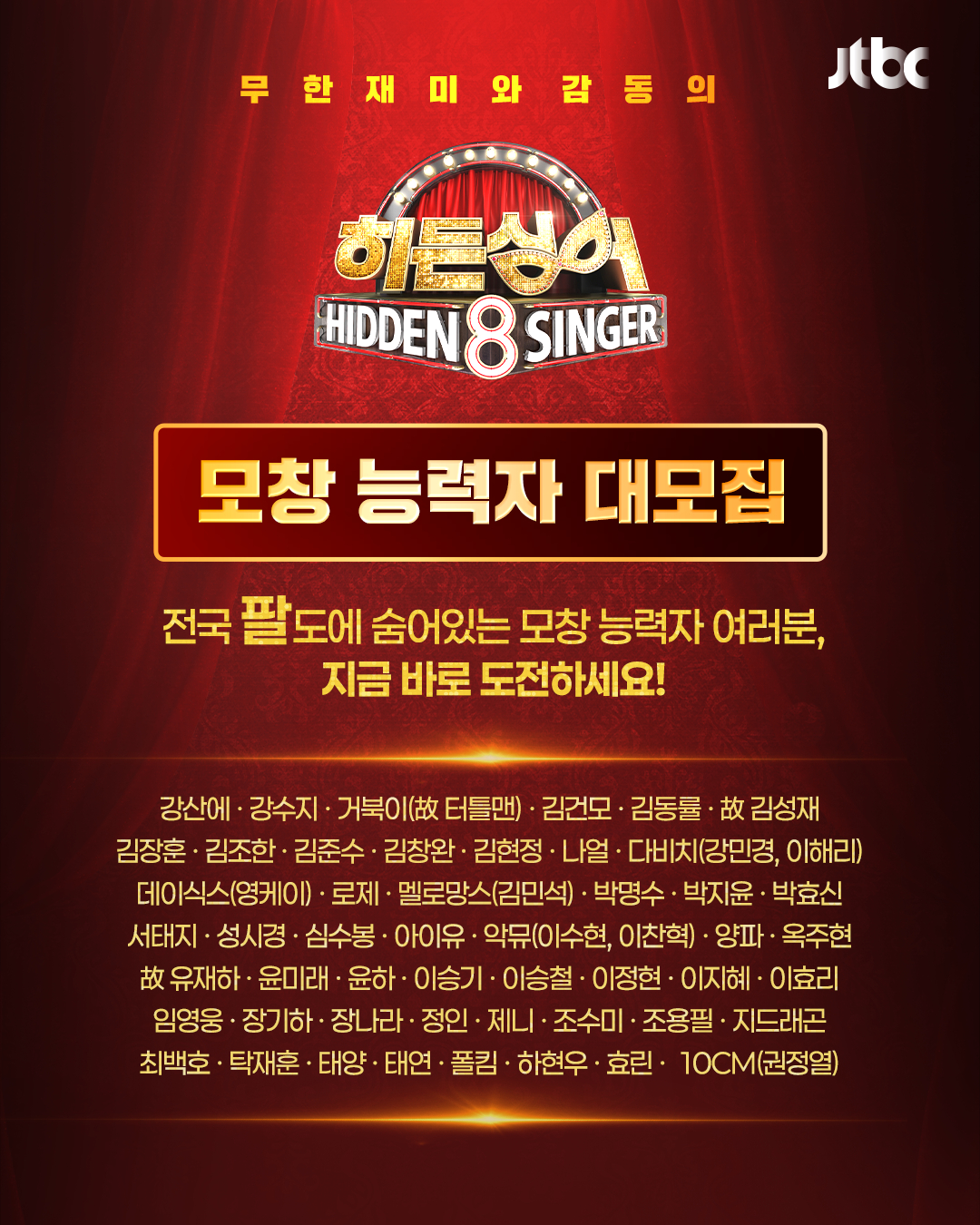 [스타뉴스|윤성열기자]/사진제공=JTBC'히든싱어'가3년만에8번째시즌으로돌아온다.2일JTBC에따르면JTBC대표음악예능프로그램'히든싱어'(연출신영광)는시즌8제작을확정짓고모창능력자모집에나선다.2022년11월막을내린'히든싱어7'이후약3년만이다.지난2012년첫시즌을선보인'히든싱어'는원조가수와모창능력자들이대결을펼치는음악버라이어티프로그램이다.이문세,임재범,이승환,신승훈,이소라,양희은,싸이,엄정화,아이유등84명의최정상가수들과모창능력자들이출연해꾸준한화제를모았다.'히든싱어8'은방송에앞서원조가수와뛰어난싱크로율을자랑하는모창능력자를모집한다.제작진은이날강산에,강수지,고(故)터틀맨(거북이),김건모,김동률,고김성재,김장훈,김조한,김준수,김창완,김현정,나얼,다비치(강민경,이해리),영케이(데이식스),로제,김민석(멜로망스),박명수,박지윤,박효신,서태지,성시경,심수봉,아이유,악뮤(이수현이찬혁),양파,옥주현,고유재하,윤미래,윤하,이승기,이승철,이정현,이지혜,이효리,임영웅,장기하,장나라,정인,제니,조수미,조용필,지드래곤,최백호,탁재훈,태양,태연,폴킴,하현우,효린,권정열(10CM)을포함한화려한모집리스트를공개했다./사진제공=JTBC공개된원조가수예상라인업에는강산에,김창완,조수미,나얼,이효리등리빙레전드들이포함됐다.또한'히든싱어1'첫회의주인공성시경과최연소원조가수아이유가다시한번이름을올려10여년만의리매치를기대하게한다.또한시즌2고김광석,시즌4고신해철,시즌7고김현식편에이어이번시즌에는고김성재,고터틀맨(거북이),고유재하의이름이모집가수명단에올라왔다.이에'히든싱어8'이팬들을위한특별한추모의자리가될지관심을모은다.제작진은"벌써8번째시즌을맞이한다.시즌8에서는더욱다채롭고폭넓은세대의아티스트들이참여해전세대를아우르는무대를보여줄예정이다.원조가수와모창능력자가만들어낼예측불가의무대를기대해달라"고전했다.윤성열기자[email protected]©스타뉴스&starnewskorea.com,무단전재및재배포금지