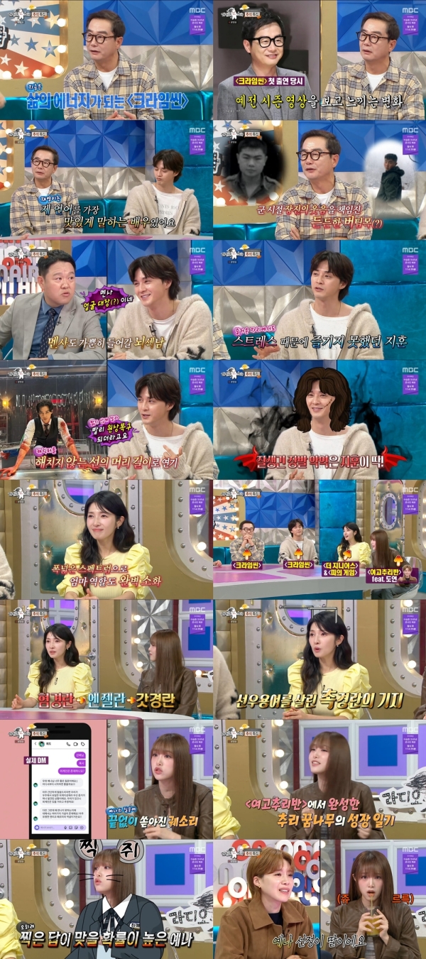 사진=MBC[스포츠투데이김태형기자]장진,김지훈,김경란,가수최예나가출연한'라디오스타'가웃음과진심이공존하는'감넘치는토크'로온가족이함께하는명절,시청자들의마음을사로잡으며동시간대1위를차지했다.8일방송된MBC'라디오스타'는장진,김지훈,김경란,최예나가출연한'감다살았네'추석특집으로꾸며졌다.9일닐슨코리아에따르면이날방송은가구기준동시간대시청률1위를기록했으며,'최고의1분'은김지훈이잘생긴장발악역원톱으로꼽히는에피소드를전하는장면이차지했다.12년만에'라디오스타'에출연한장진은최근넷플릭스추리예능'크라임씬제로'출연비화를전하며"이제는녹화날이기다려진다.놀이공원가는기분이다"라고말했다.그는"한에피소드당20시간을촬영하지만힘들지않다.예능이삶의활력소가됐다"고전하며특유의차분한유머로웃음을자아냈다.장진은이번시즌의압도적인스케일을언급하며"건물3~4층짜리가세워지고한강다리까지만든다.예능세트가이정도면이사람들돈벌생각이없나싶었다"고너스레를떨었다.또"이번엔게스트제도가생겨서박성웅,주현영,황인엽,하석진,전소민같은배우들이함께했다"고해기대감을높였다.장진은"대학인맥으로먹고산다"며웃음을터뜨리면서도,"좋은사람들과오래함께할수있다는건행운이다.나이들수록그말이실감난다"고말했다.연극과동기김진수,정웅인,그리고후배신동엽,류승룡,정재영,임원희,황정민,신하균과의인연을언급하며"정재영은내언어를가장맛있게말하는배우다.더나이들기전에다시함께작품하고싶다"고밝혔다.MC김국진이"서울예대시절가장기억에남는'관종'이누구냐"고묻자장진은임원희를꼽아웃음을터트리게했다.그는임원희와의군시절인연을밝히면서"부모님도제가어디있는지모르던시절,갑자기면회신청이들어왔다.보니임원희의부모님이셨다.어머님은임원희의면회를,아버님은제면회를신청하셨다.옆부대에있던선배라챙긴거다.군대랑안어울리는친구지만큰버팀목이었다.임원희가있어서든든했다"고회상했다.김지훈은지난달공개된넷플릭스'크라임씬제로'에대해"더큰플랫폼,더큰스케일로돌아왔다"고자랑했다.지난시즌에는섭외가안돼서운했다고털어놓으며"윤현준PD님이직접동네까지찾아와밥을먹자고하더라.그때'이번엔진짜나구나'했다"고섭외비하인드를밝혔다.그는'헛방의제왕'이라는별명에대해"범인을못잡으면범인이1000만원을가져가는데엉뚱한사람을찍었다.너무창피해서2주동안잠을설쳤다"고말해웃음을자아냈다.김지훈은IQ150의뇌섹남면모를드러내며"수능수리영역을두개틀렸다"고했는데,장진은"근데왜(예능에서)헛방을쏘냐"고말해폭소케했다.김지훈은프라임비디오오리지널드라마'버터플라이'로할리우드에진출한근황도밝혔다."미국드라마오디션을영어로봤는데감사하게도합격했다.대니얼대킴이관객앞에서나를'한국의조니뎁'이라고소개했다"고말했다.배우로서도약을위해3년의공백기를가졌다는그는"'바벨'에서폭력남편으로이미지변신을시도했고,그역할덕분에'악의꽃'에캐스팅됐다"고밝혔다."'악의꽃'은인생작이다.식물인간상태로8회동안누워있었는데,깨어나는순간이강렬해서감사했다"고밝혔다.김지훈은"선택받는직업이라불안할때도많지만,결국버티는게내힘이었다.앞으로도작품을통해새로워지고싶다"고진심을전하며"예능이든연기든,결국은진심으로임하는게답이다"라고말했다.김경란은"작년부터삶의1순위를방송에서연기로바꿨다.요즘은상암동보다대학로가더익숙하다"며배우로서의전환을전했다.그는"12년간방송국출근하던직원이었는데,오랜만에오니혼자얼어붙었다.삶이란참재밌다"고말하며웃었다.올해만세편의연극에서연달아엄마역할을맡은그는"올해만자식셋이생겼다.'갈매기'에서는딸이있었고,'세상참예쁜오드리'에서는아들이있었다.그아들이두살차이나는태사자김영민이었다"고말해웃음을유발했다.이어"'기억의숲'에서는연쇄살인범아들을둔사이코패스엄마를연기했다.본의아니게현생에없는자식이많아졌다"고말해스튜디오를웃음바다로만들었다.김경란은예능촬영중배우선우용여의이상징후를발견해생명을구한일화도전했다."당시건강프로그램을진행했는데,선우용여선배님이말의앞뒤가안맞았다.이상해서촬영을중단하고의사에게진료를부탁했더니뇌경색이었다"고말했다.이에MC김구라는"그일이후선우용여선배님이인생관이바뀌었다.매일뷔페를즐긴다고하더라"라고웃음을자아냈다.김경란은"내년엔10대역할에도전한다.부끄럽지만용기있게해보려한다"고밝혔다.이에MC김구라가"뒷모습이10대같다.최예나인줄알았다"고말하자그는소녀미소로화답해화기애애함이넘쳤다.그는"삶이란참재밌다.배우로서지금이제일설렌다.앞으로도무대와방송에서다양한모습을보여드리고싶다"고포부를전했다.최예나는"BTS진선배님의솔로앨범'루저'피처링제안을받았다"며"노래를듣자마자내스타일이라무조건하겠다고했다"고당시상황을말했다.이어진의콘서트게스트로선비화를밝히며"아침부터대패삼겹살을구워줬다.월드클래스는다르더라.라면종류만해도몇가지가되더라"고말해웃음을자아냈다.그는"추리예능'여고추리반'에출연하면서'크라