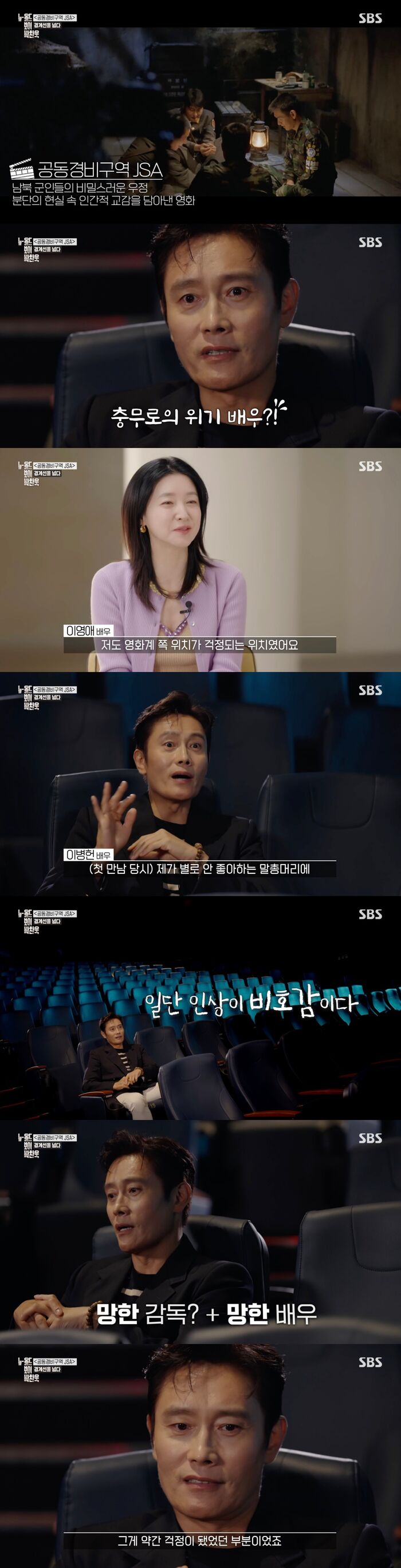[SBS연예뉴스|김효정에디터]이병헌이'공동경비구역JSA'를시작하기전불안함을고백했다.8일방송된SBS추석특집다큐멘터리'뉴올드보이박찬욱'에서는영화감독박찬욱을조명했다.영화감독박찬욱을세상에알린영화'공동경비구역JSA'는사실시작부터순탄치않았다.이에배우이병헌은"저도이미3편의영화를망한충무로위기의배우였을때이영화를만났다"라고밝혔다.배우이영애역시"저도영화계위치가걱정되는위치였다.앞선전작이만족스러운결과를낳지못해영화배우로입지를다지지못한상태였다"라고당시를떠올렸다.그리고이병헌은박찬욱감독과의첫만남을떠올리며"제가별로안좋아하는말총머리에의상도특이하게입고등장했다.그래서인상이비호감이었다"라고했다.이어그는"망한감독과망한배우가과연어떻게좋은작품을만들어낼수있을까가걱정인부분이었다"라며영화계의입지가불안했던감독과배우들이어떤시너지를일으킬지상상조차하지못했음을고백해눈길을끌었다.Copyright©CopyrightⓒSBS.Allrightsreserved.무단전재,재배포및AI학습이용금지