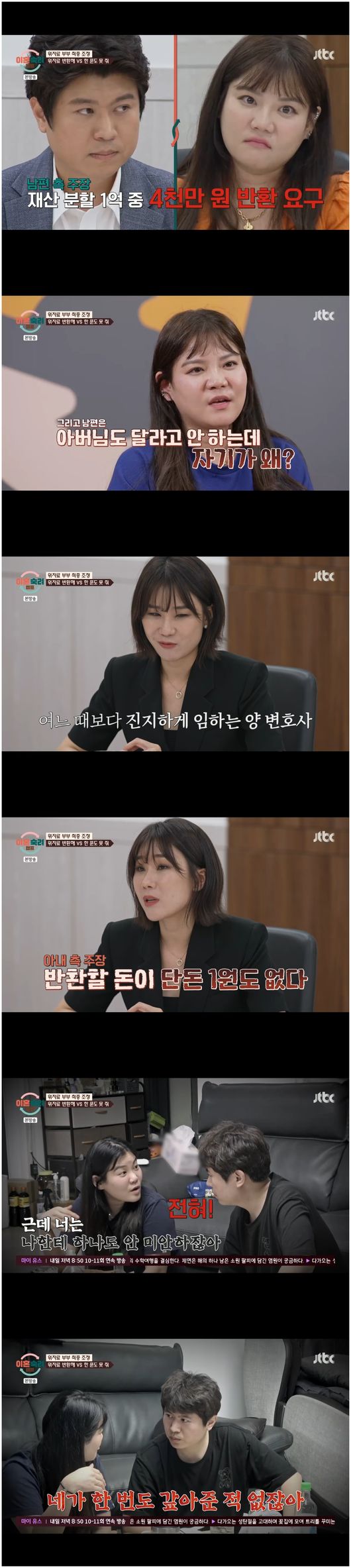 <리뷰:방송시청후작성된리뷰기사입니다.>[OSEN=오세진기자]‘이혼숙려캠프’실제이혼조정기간중숙려캠프에참여했던위자료부부아내강효정과남편김대기가결국이혼을협의,재산재분할논쟁에휩싸였다.9일방영한JTBC‘이혼숙려캠프’에서는위자료부부의실제이혼이선언됐다.남편김대기는이혼을원치않는다고했으나아내강효정은“아버님이결국나중에다시문제가되실거같다”라면서“이곳에온이유는이혼을잘하기위해온것이다”라며후련하게이혼을결정했다.이들은사실사전에재산을합의했다.이에남편은아내에게돌연재산재분할을요청했다.4천만원은돌려받아야한다는주장이었다.남편측변호사박민철은“재산은상가등3억원,코인채무,아버님께진빚등각1억2천만원씩이다”,“경제적기여도5:5라고따지면6천만원씩가지되장모님께빚을졌으니전체적으로6:4로나눠야하지않냐”,“그리고유책사유도남편쪽으로꼭볼수없다.시아버지부분은서로주장이다르다”라며논리정연하게먼저남편입장을전했다.양나래변호사는“충분히잘들었고요,저희는반환할돈이1원도없습니다.코인하면서개인채무까지포함을했는데,채무가분할대상이될때는부부공동재산이되어야한다.이건남편독단적인발생채무다.이건논외다”라며단번에반박했다.또한시아버지에대한채무는남편이건넨생활비200만원중100만원씩갚으므로생활비기여는적었으나,꿋꿋이자신이더많이기여를했다고주장하며아내의소비를문제삼고들었다.이성호판사는“재산분할이크니그대로두고,위자료부분을어떻게할지,시아버지부분을줄이는것은어떨까”라며말했다.시부모가사실상위자료지급의무는법적으로거의없었던것.강효정씨는“그럼남편한테2천만원받는걸로할게요.저는6년동안고생했어요”라고말했으나강효정씨는“그러면그럴게요”라고말하면서“그냥그거먹고떨어져라.구질구질하게하지마라”라며헛웃음을지었다./[email protected][사진출처]JTBC‘이혼숙려캠프’Copyright©OSEN.무단전재및재배포금지.