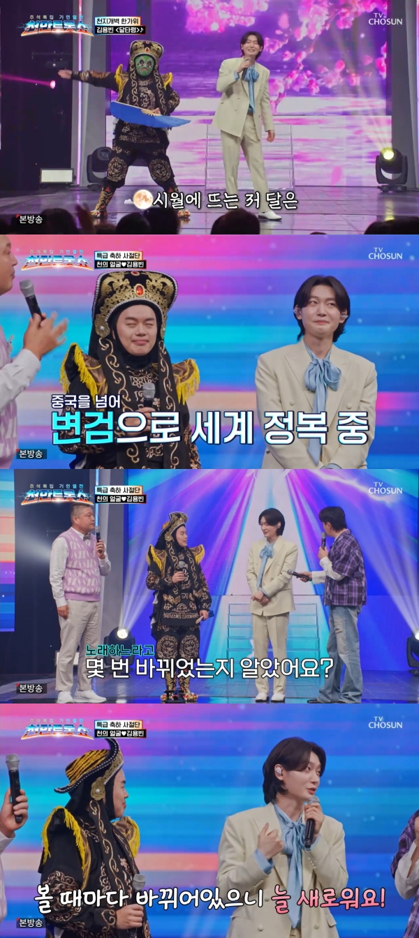 사진=TV조선[스포츠투데이김태형기자]가수김용빈이변검술사와함께흥겨운무대를펼쳤다.9일방송된TV조선추석특집'천만트롯쇼'에는김용빈의'달타령'무대가공개됐다.이날특급축하사절단으로눈깜빡할사이에얼굴을바꾸는변검술사가등장했다.김용빈은그옆에서'달타령'을부르며흥을돋웠다.무대를마치고김용빈은변검술사구본진과반갑게인사했다.구본진은"19살때부터중국에가서변검을수련했다"고밝혔다.총14가지의가면이있으며,자신의얼굴까지포함하면15가지라고.MC붐이김용빈에게"노래신나게하면서얼굴이몇번바뀌었는지알겠어요?"라고묻자,김용빈은"모르겠어요.볼때마다얼굴이바뀌니까늘새로워요"라고답해웃음을자아냈다.[스포츠투데이김태형기자[email protected]]Copyright©스포츠투데이.무단전재및재배포금지.
