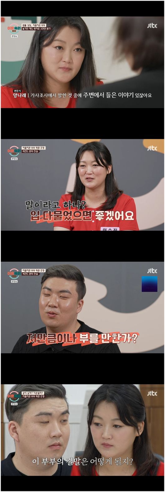 <리뷰:방송시청후작성된리뷰기사입니다.>[OSEN=오세진기자]‘이혼숙려캠프’'지팔지꼰'부부의이혼조정이시작되었다.9일방영한JTBC‘이혼숙려캠프’에서는지팔지꼰부부박성현,이수진의이혼조정이시작되었다.남편박성현은이혼을원치않는다고했으나,남편측변호사박민철은냉정하게남편의유책사유를짚고넘어가고자했다.박성현은말을얼버무렸다.남편은“그런건아니다.계속바뀐다.채팅어플리케이션을하는데,이젠아무것도시도를안한다”,"바람피운거하나로끝날줄"이라고답변했다.변호사박민철은“외도횟수,만남횟수모두다체크가된다.다외도행위로규정된다.그러면위자료를줘야한다”라고말했다.그러자그는“관계를가지고오래만나야바람인줄알았다.짧게짧게만난정도는바람은안되는줄알았다.내가잘못생각했더라”라며당황했다.심지어만남횟수도속이고자했다.변호사박민철은“변호사가의뢰인이랑이야기를했는데도조정장을갔을때명백한증거가나올때다.이러면아무것도못한다.변호사를속여서뭐할거냐”라며일갈했다.이후조정장에서남편은“만나서커피를마시거나담배를피우는거아니냐”라며채팅어플리케이션으로만난것에대해아무렇지않게말해모두를기겁하게만들었다.아내는“정말기가막혔다.입을다물었으면좋겠다”라며끓는속을참지못했다./[email protected][사진출처]JTBC‘이혼숙려캠프’Copyright©OSEN.무단전재및재배포금지.